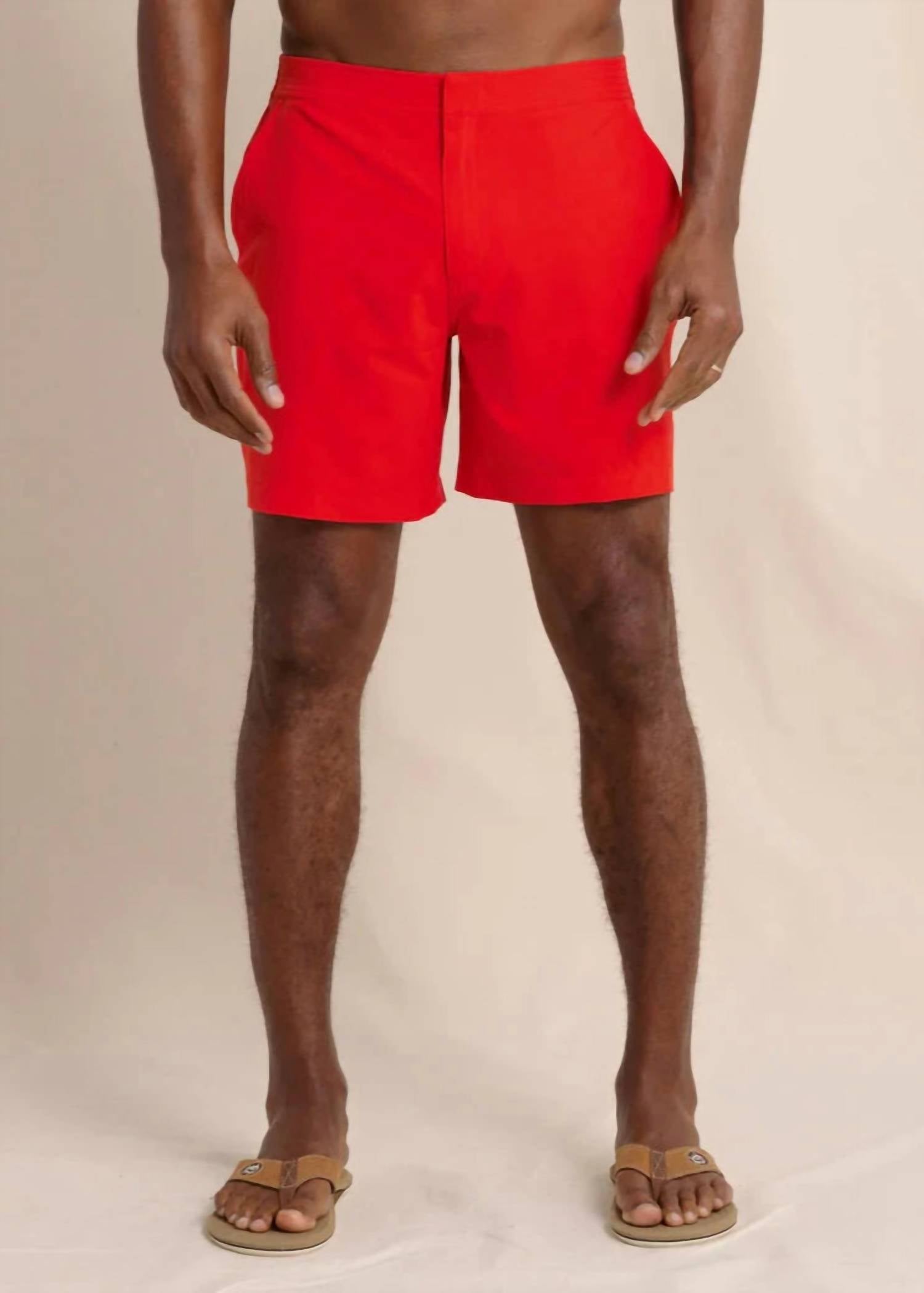 Experience the ultimate in swimwear with the Men's Shelter Cove Swim Trunk by Southern Tide in striking Poppy Red. Perfect for a beach day, these swim trunks feature a 7" inseam and are made with a robust blend of 52% Polyester, 38% Recycled Polyester, and 10% Spandex. Designed with functionality in mind, they include a micro-mesh brief liner, partial elastic back waistband, and a functional zipper fly with a two-snap closure. These solid swim trunks offer 4-way stretch, UV protection, and water-repellent properties, ensuring comfort and style with machine wash and tumble dry ease.