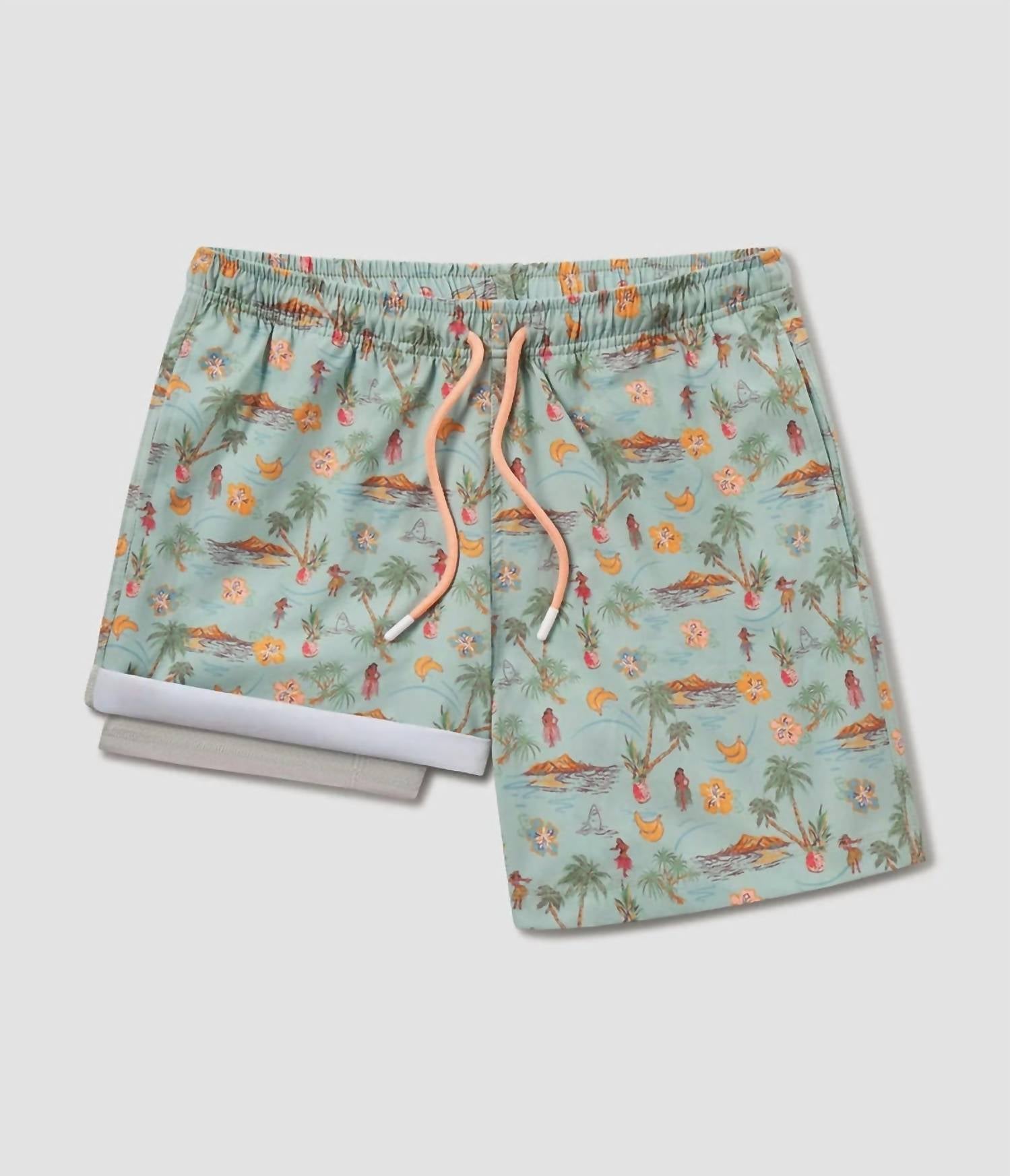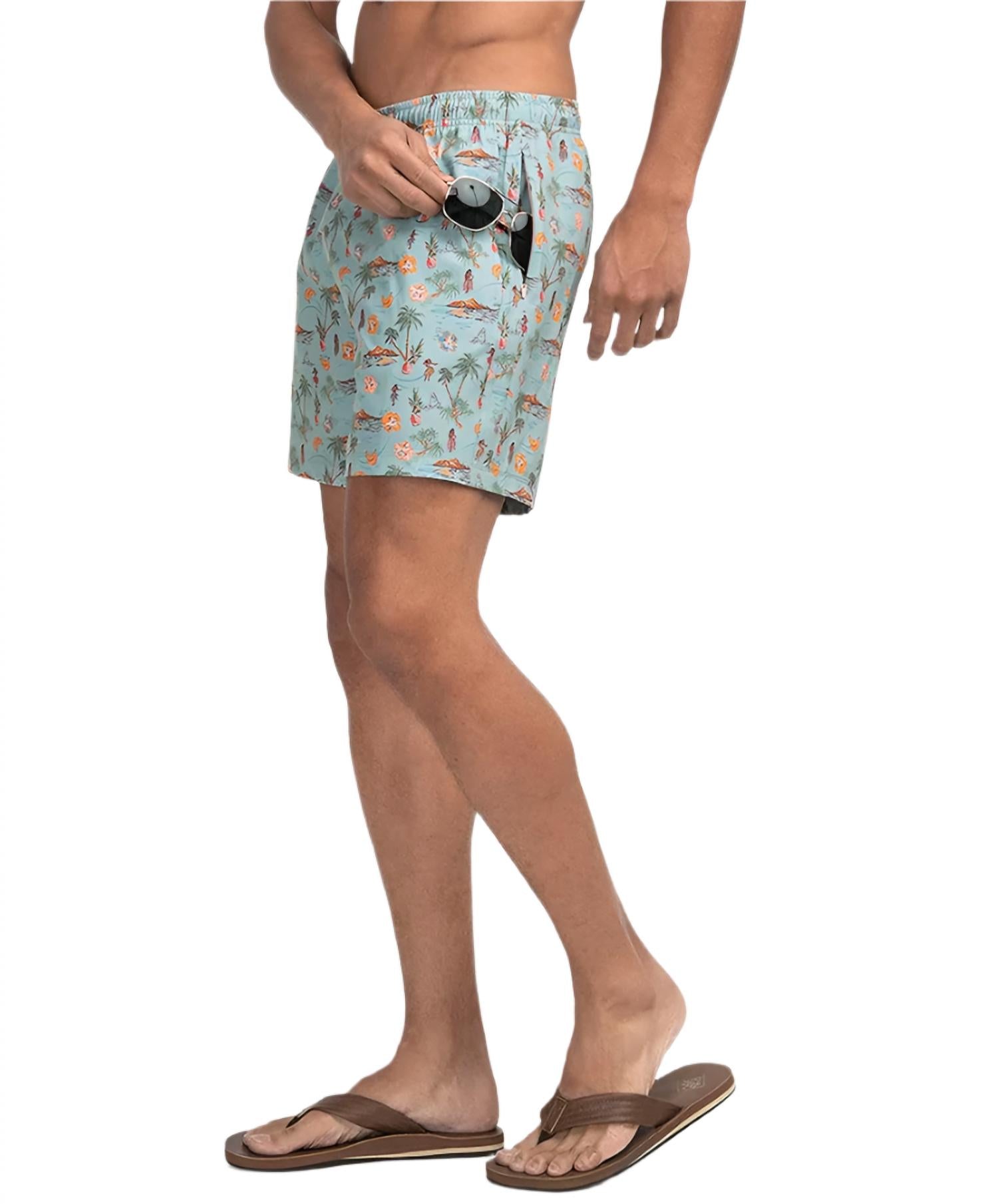 Dive into summer with the SOUTHERN TIDE Men's Swim Shorts in Hula Hideaway, bringing vibrant style to your beach day. Featuring a 5.5-inch inseam and a handy elastic waistband with drawstring, these patterned board shorts are crafted from 91% Polyester and 9% Spandex for a comfortable fit and 4-way stretch. Designed with both functionality and fashion in mind, these shorts offer water repelling capabilities, on-seam side pockets, a back right pocket, a side hidden zipper pocket, and an inner compression short liner. For easy maintenance, simply machine wash and tumble dry.
