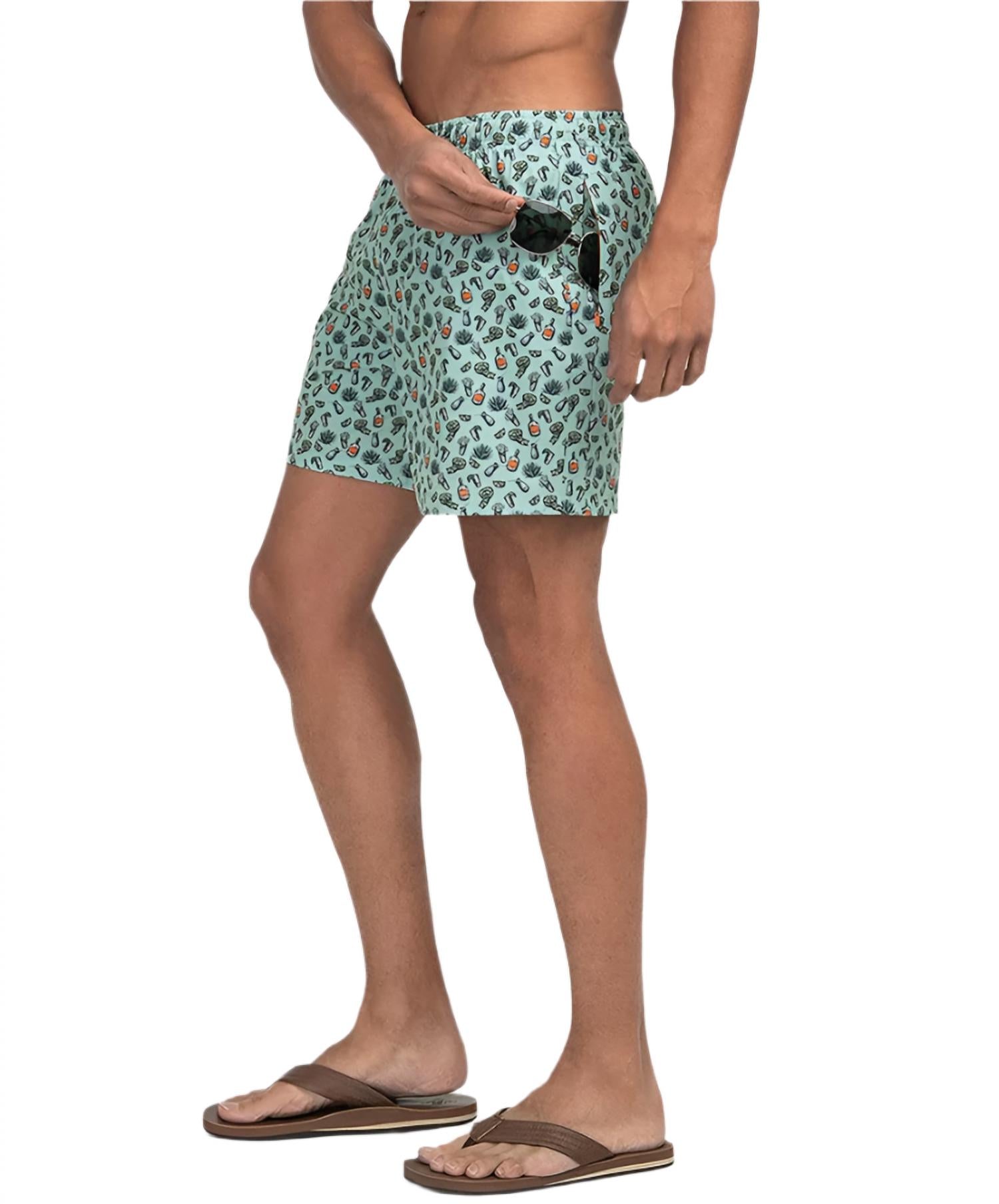 Dive into summer with the SOUTHERN TIDE Men's Swim Shorts in Hula Hideaway, bringing vibrant style to your beach day. Featuring a 5.5-inch inseam and a handy elastic waistband with drawstring, these patterned board shorts are crafted from 91% Polyester and 9% Spandex for a comfortable fit and 4-way stretch. Designed with both functionality and fashion in mind, these shorts offer water repelling capabilities, on-seam side pockets, a back right pocket, a side hidden zipper pocket, and an inner compression short liner. For easy maintenance, simply machine wash and tumble dry.