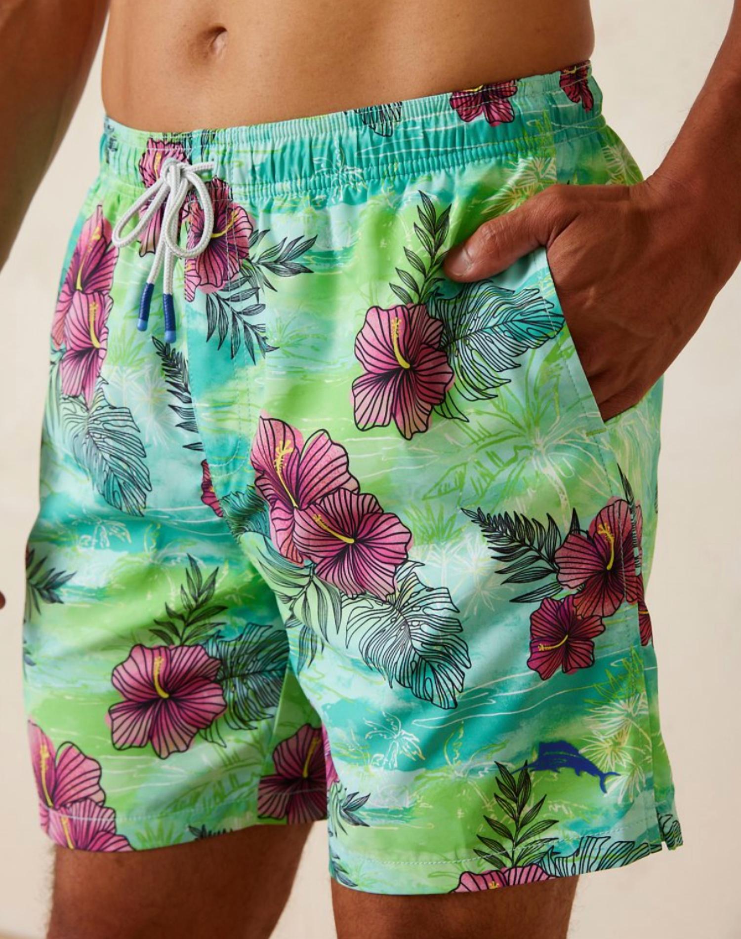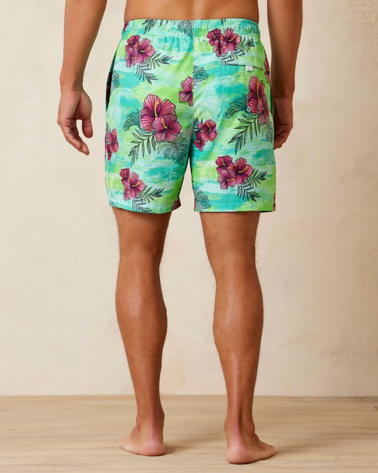 Unleash your island spirit with Tommy Bahama's Naples Fresco Blooms Swim Trunks in Spectra Green, a vibrant addition to your summer wardrobe. These shorts, crafted from 100% recycled polyester, offer a 6" inseam and floral pattern, perfect for any sunny day. Designed for comfort, they feature an easy pull-on style with an elastic waist and customizable drawstring, complete with a handy back pocket. Care for them is effortless: machine wash cold on gentle, avoid fabric softener, and tumble dry low.