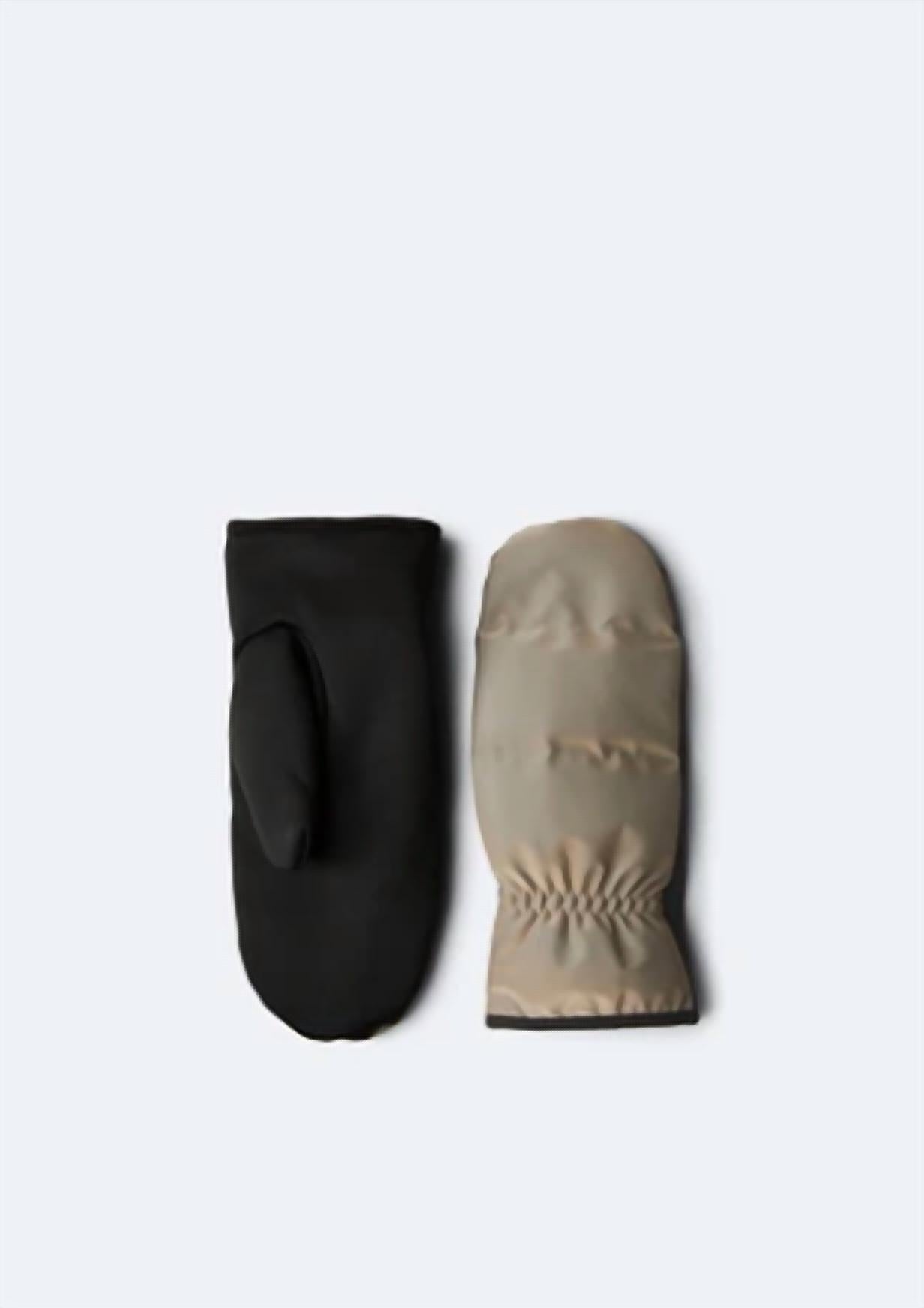 Discover the Rains Mittens Quilted in Velvet Taupe, crafted to provide both style and functionality. These gloves feature a lightly padded quilted PU fabric at the back hand and a soft front shell, complemented by neoprene palms for enhanced grip. Made with 100% polyester materials throughout the upper, palm, binding, and lining, with a polyurethane coating for added durability. Their elasticated cuffs ensure a snug, comfortable fit, making them an essential accessory for cold weather.