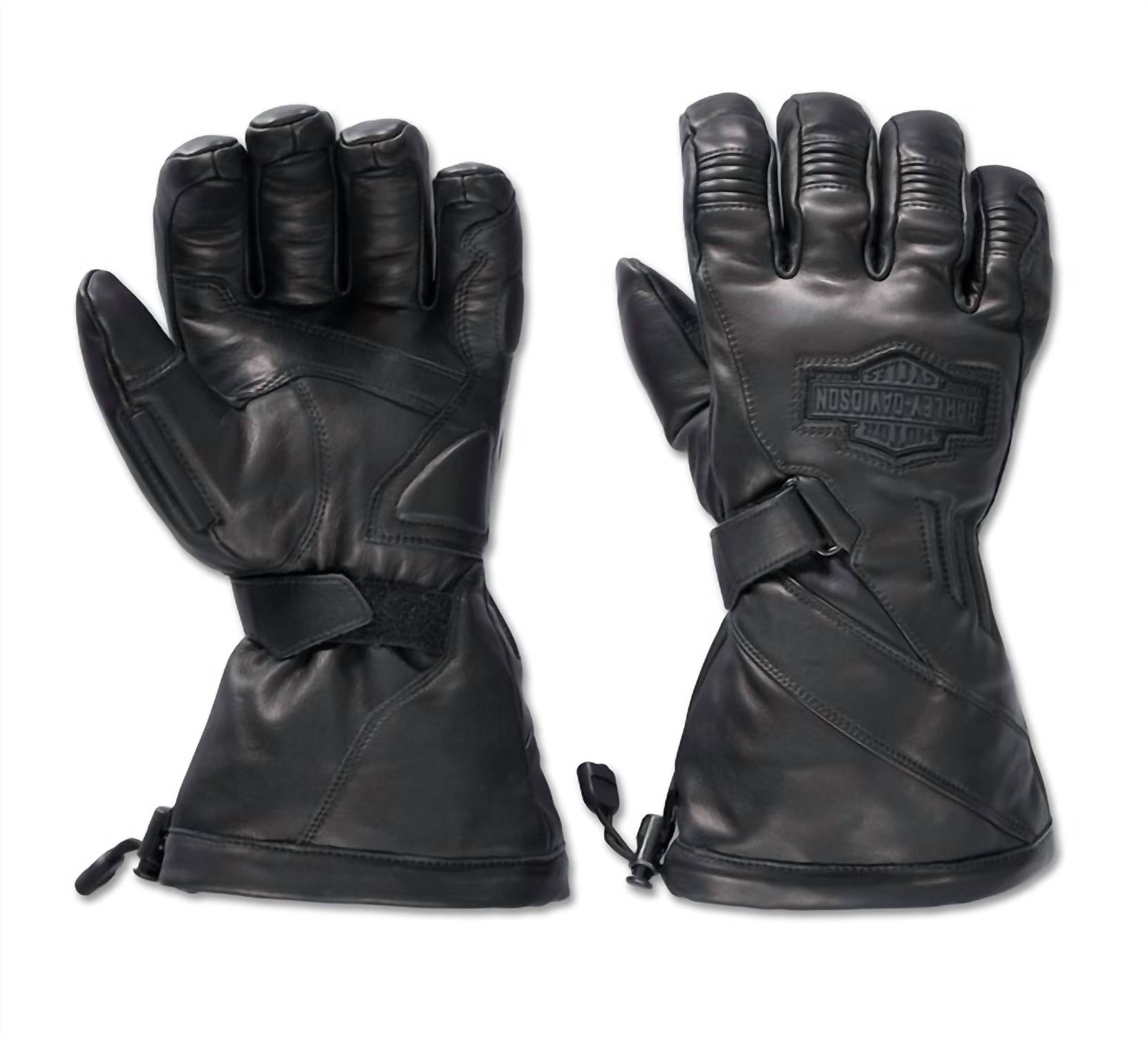 Introducing the Men's Circuit II Waterproof Leather Gauntlet Gloves by Harley Davidson, engineered for top-notch coverage and comfort. These gloves are crafted from durable cowhide leather with 100% polyester tricot lining and enhanced with 3M™ Thinsulate™ insulation for warmth. Designed with full-finger coverage and wrist-length protection, they include a roller buckle wrist strap and single-hand drawcord cuff closure for secure fit. Ergonomically crafted with 45º pre-curved fingers, padded palm, and comfort seams, these black gloves come feature-packed with a goggle wiper and minimal branding for versatile style.