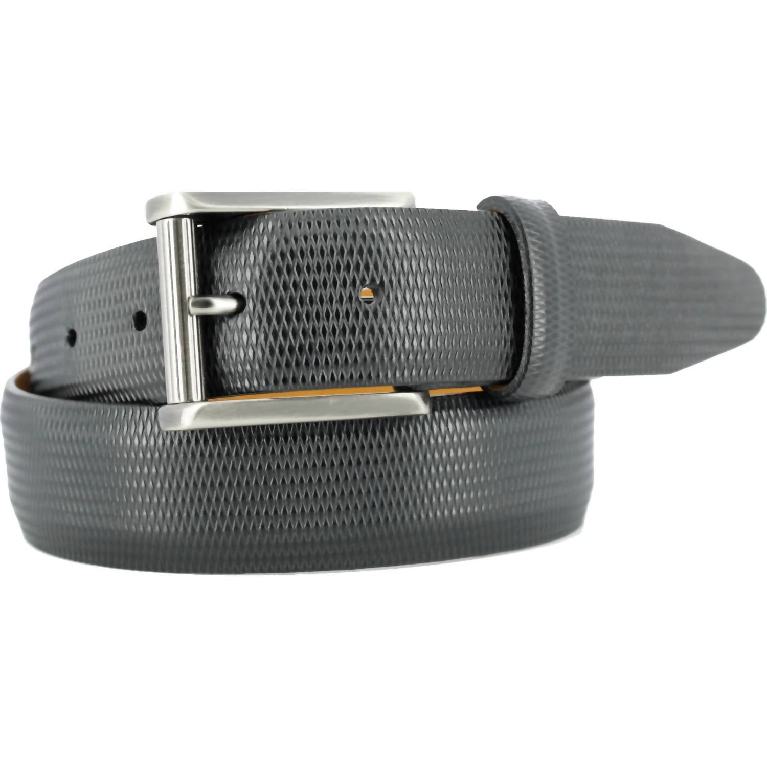 Expertly crafted from Italian calfskin leather, featuring a refined diamond-printed texture that exudes timeless style. Lined with Tulliani nubuck leather for comfort and finished with a brushed gunmetal buckle. Made in US. Feather-edge design at a 35mm width suits both dress pants and jeans seamlessly.