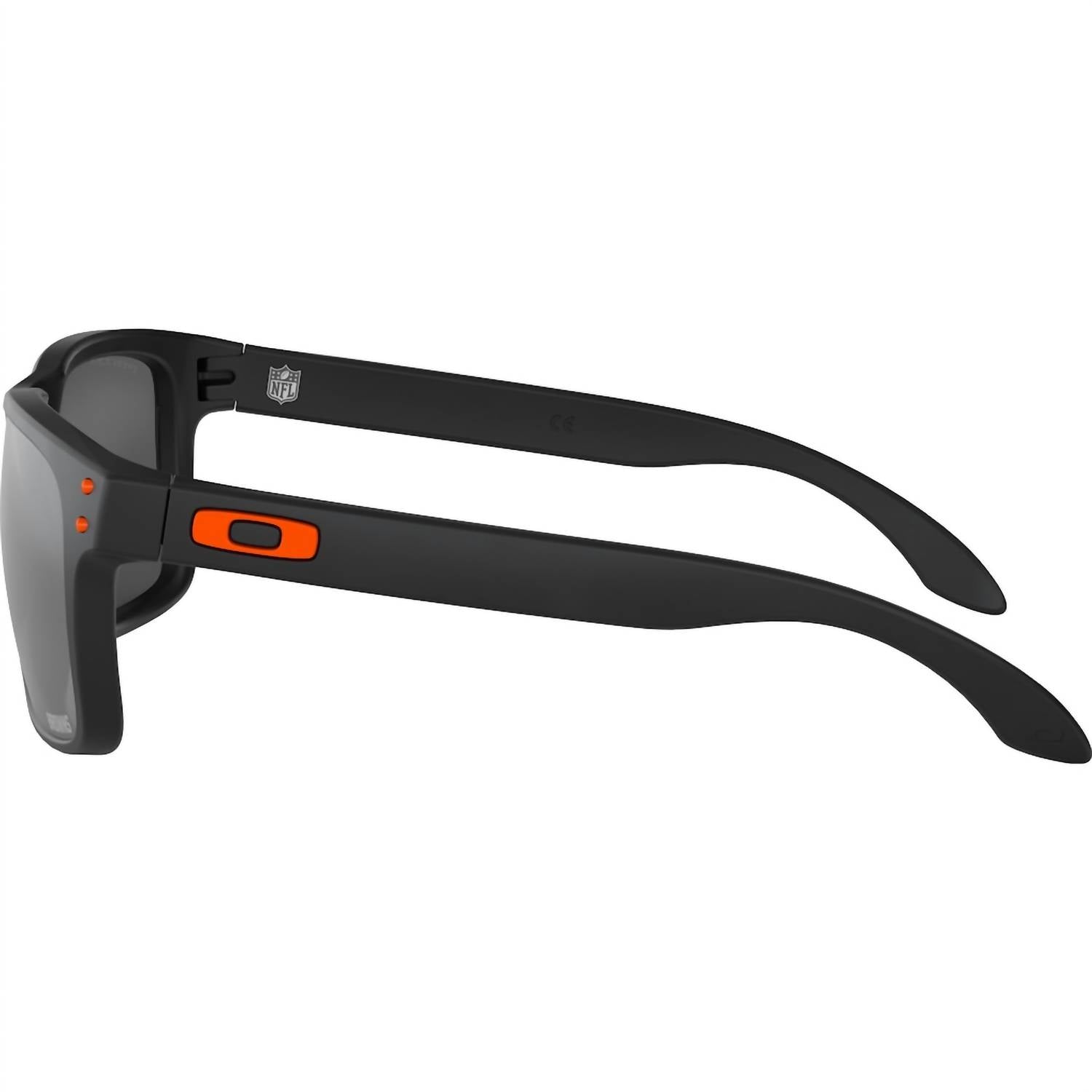 Show your support for the Cleveland Browns with the Men's Holbrook Cleveland Browns Edition Sunglasses by Oakley. These sunglasses feature a square style crafted from lightweight O Matter™ frame material with matte black and team color accents. The Prizm™ tungsten lenses are designed with team logo etching and ensure 100% UV protection. With dimensions of 57mm lens width, 18mm bridge width, and 137mm temple length, these sunglasses offer a comfortable fit.