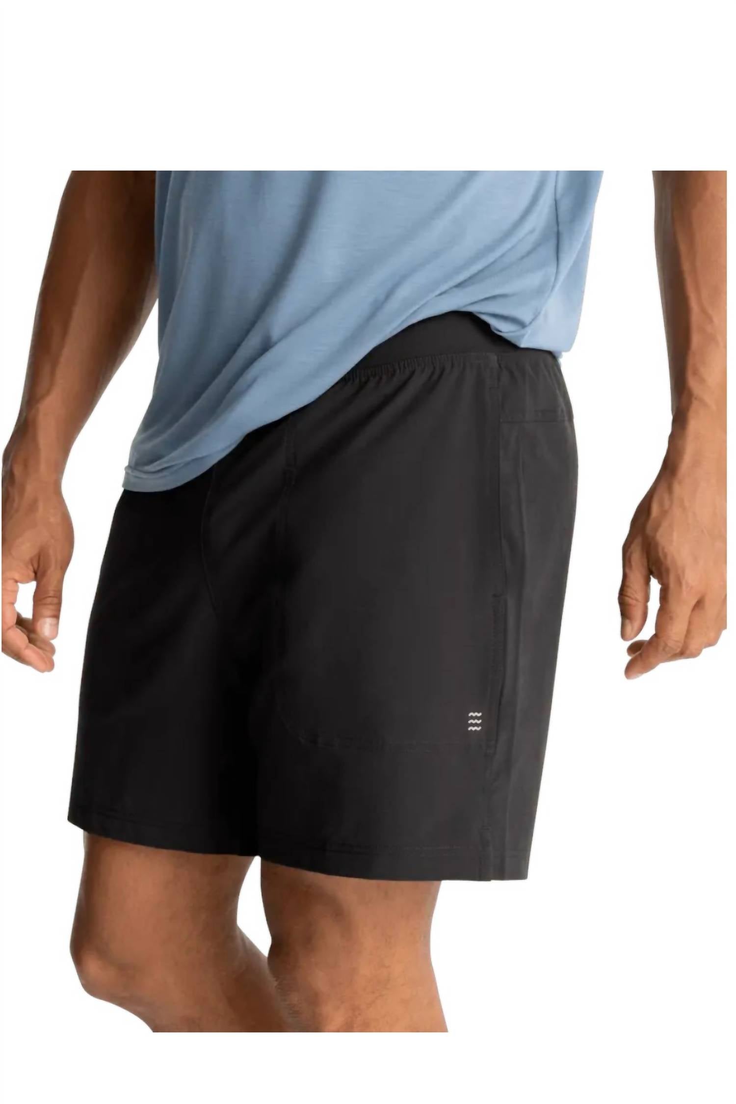 Introducing the Men's Active Breeze Short by FREE FLY, an ideal choice for fitness and everyday activities. Designed in a classic black solid pattern, these shorts feature a lightweight four-way stretch fabric that offers breathability and comfort. With a 7-inch inseam, they provide a casual style that falls above the knee and includes UPF50+ sun protection. Closure: Pull-on style; Pockets: Two hand pockets. Care: Machine wash, tumble dry.