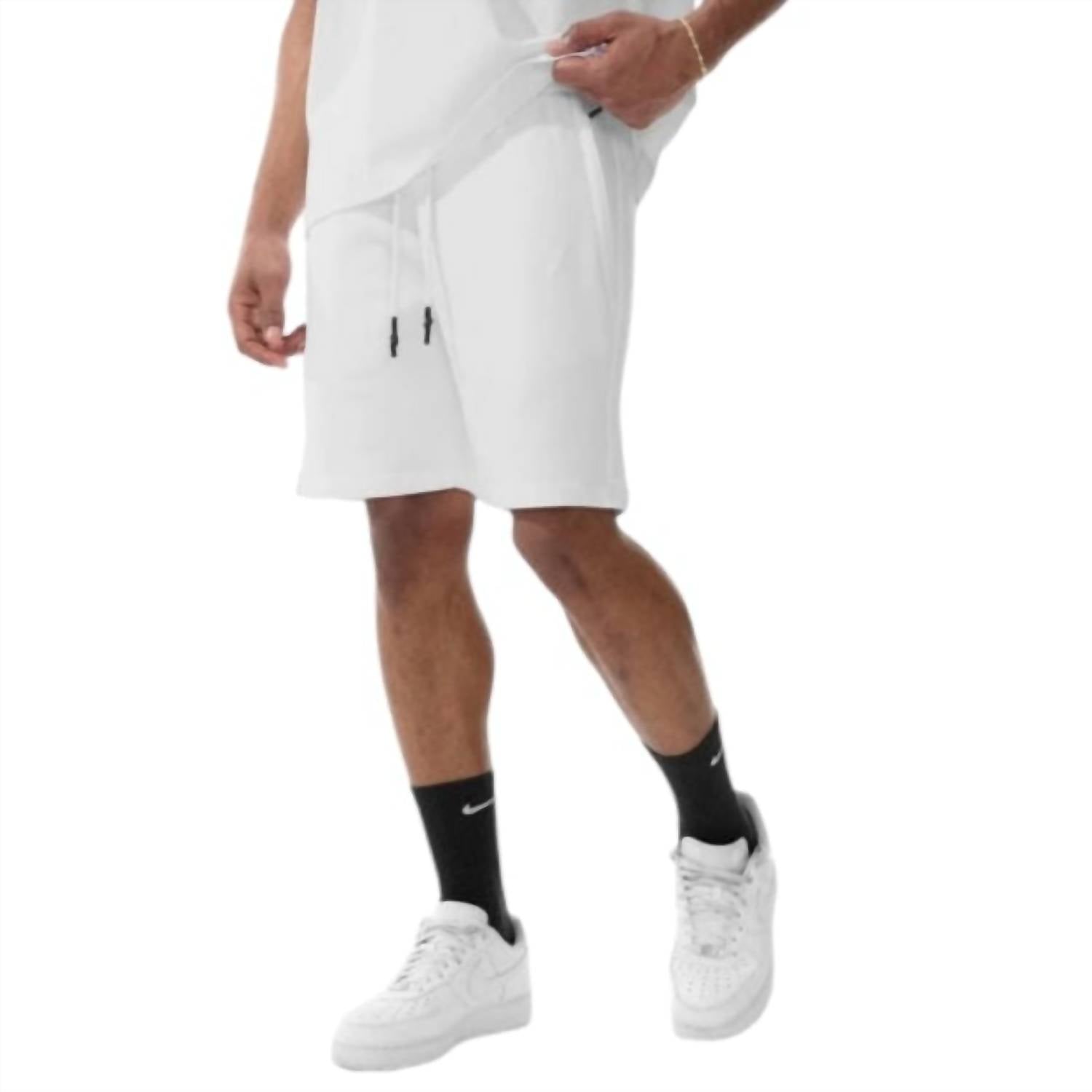 Step out in style with the Retro Burbank Short by JORDAN CRAIG, perfect for athleisure and fitness occasions. These men's shorts in solid white feature a retro short silhouette with an 8.5-inch inseam that falls just above the knee. Made from a 65% cotton and 35% polyester blend, they offer both comfort and durability. Designed with dual side pockets featuring hidden zipper openings and a back wallet pocket, they ensure practicality, while tonal adjustable drawstrings provide a secure fit. Closure: Pull on.