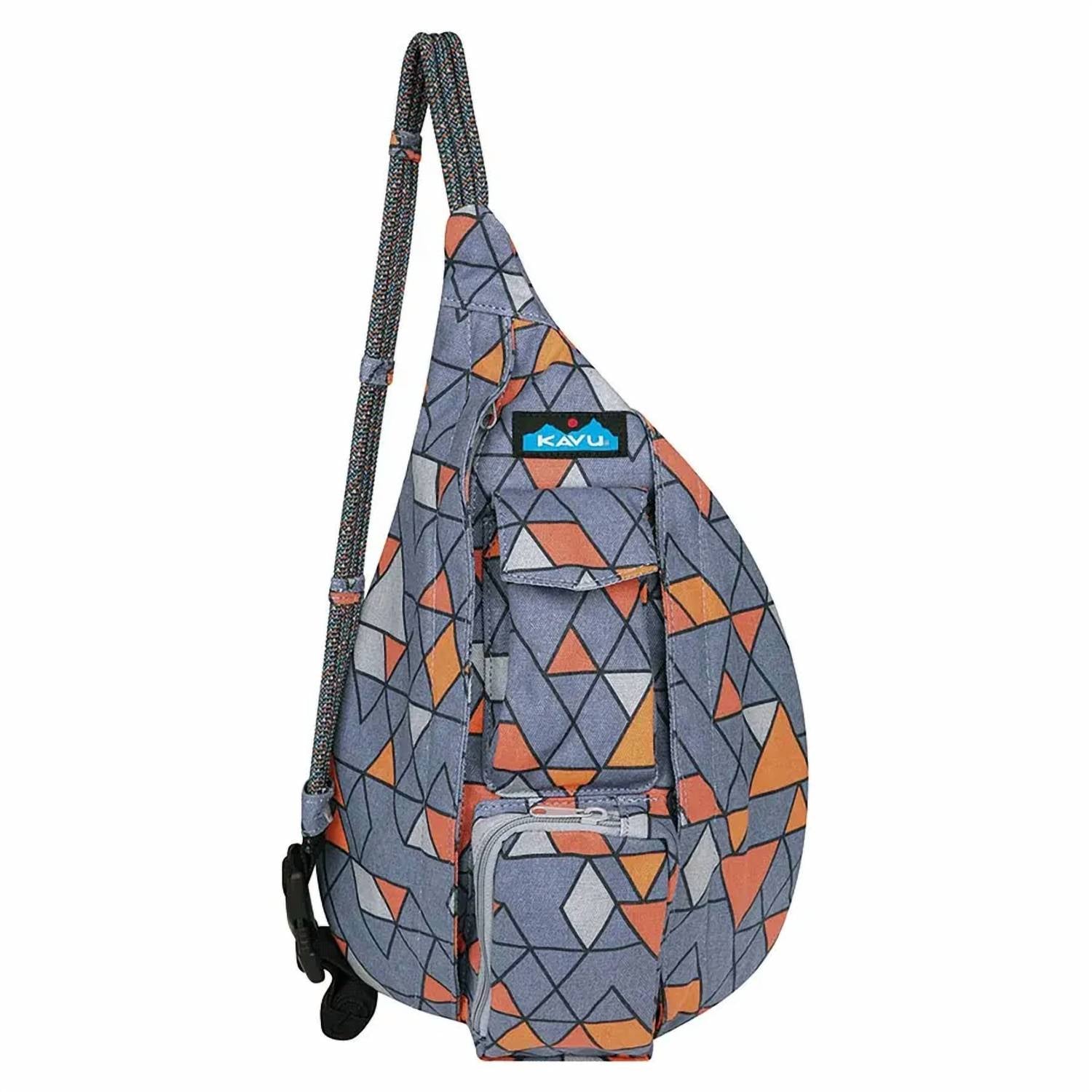 Introducing the Mini Rope Bag by KAVU, an ideal companion crafted from durable 12oz 100% cotton canvas in a vibrant MOD TILE design. Featuring an adjustable rope shoulder strap ranging from 20" to 40" with a side release buckle for ultimate convenience. This compact sling pack includes two vertical zip compartments and two interior pockets for keys or a cell phone, while a padded back adorned with KAVU embroidery ensures comfort. Dimensions of the bag are 16” x 9” x 4” with a 4-liter capacity, complemented by polyester lining for added protection.