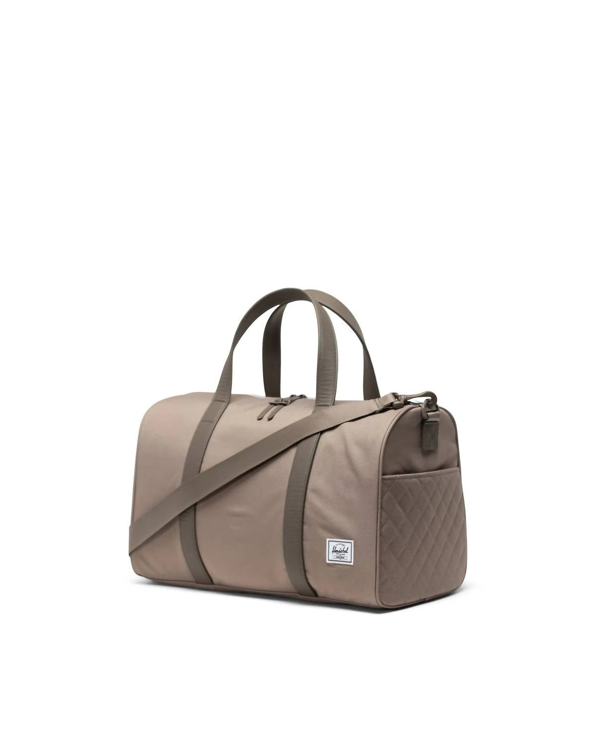 Introducing the Novel™ Duffle Carry On Bag by Herschel, a perfect blend of style and functionality in Brindle Quilted. Constructed from EcoSystem™ 600D Fabric, this sustainable duffle is made from 100% recycled post-consumer water bottles, featuring a tonal stripe EcoSystem™ liner. Designed for convenience, it includes a padded floating sleeve that fits a 13"/14" laptop and a waterproof zippered closure for added protection. The bag also boasts a removable smooth webbing shoulder strap and a removable luggage trolley strap, ensuring easy transport.