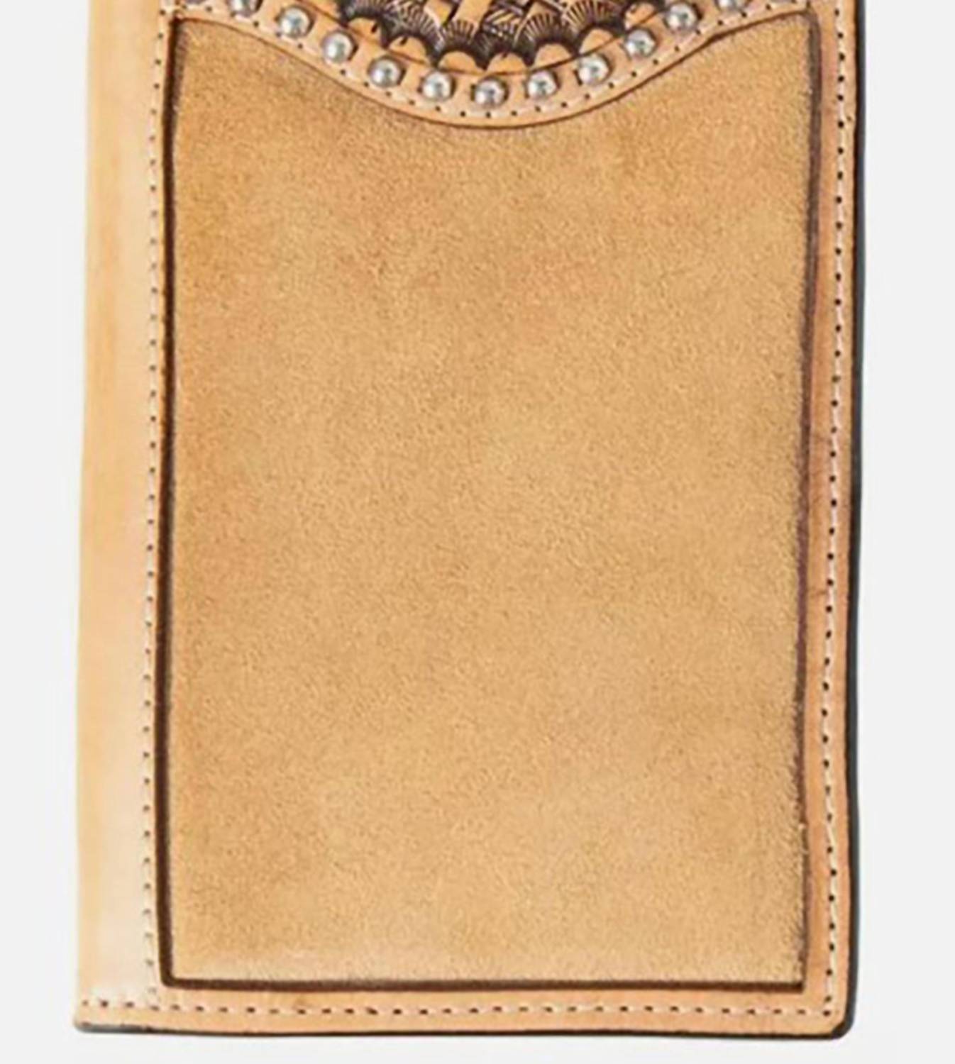 Presenting the Men's Leather Turquoise Cross Wallet by 3D Belt Company, a statement piece in genuine leather designed for the modern gentleman. This tan rodeo style wallet draws the eye with its hand tooled basket weave and sunburst design, completed with a concho featuring a natural turquoise cross for a bold touch. Inside, you'll find multiple cash and card slots as well as an ID window for convenience and practicality.