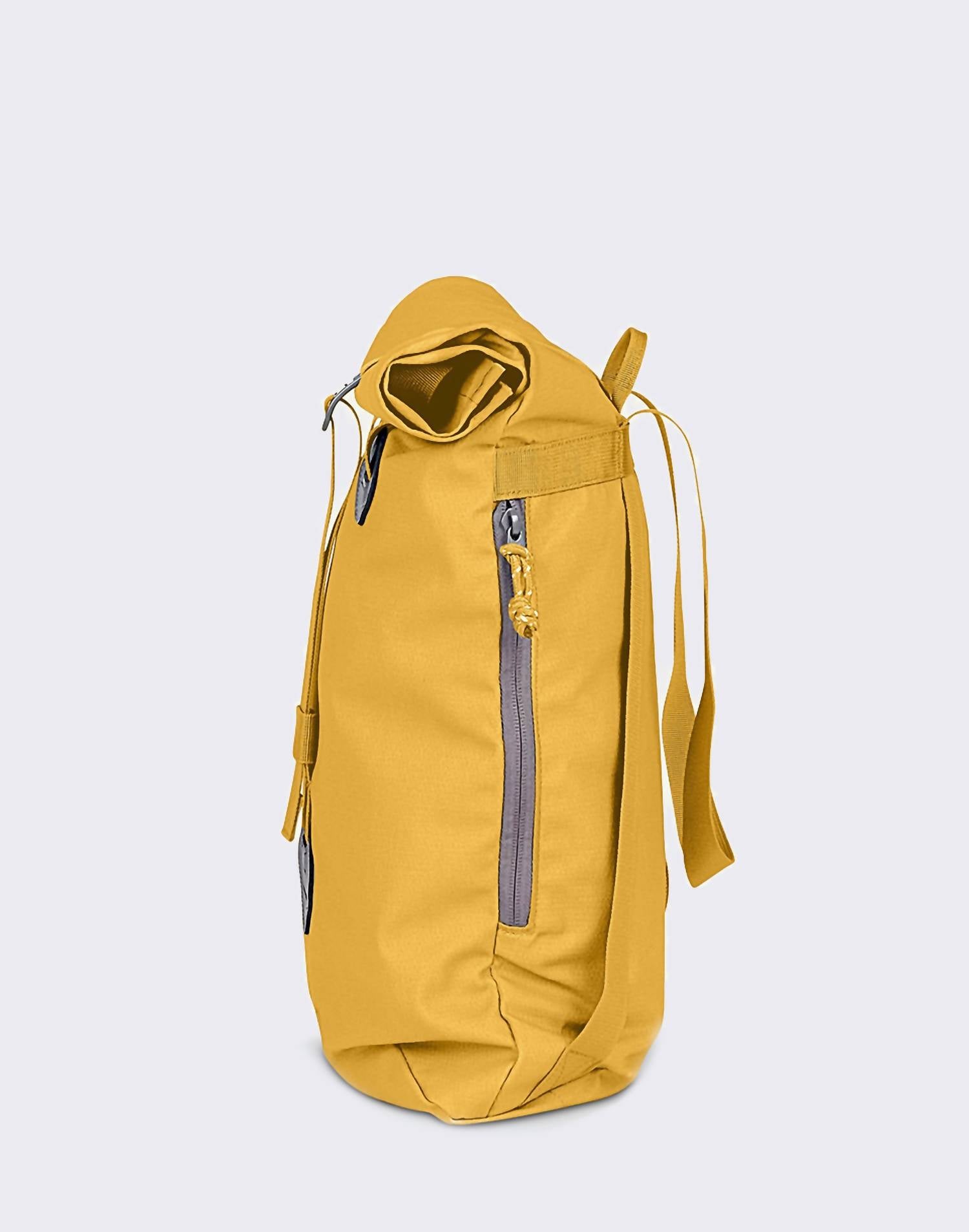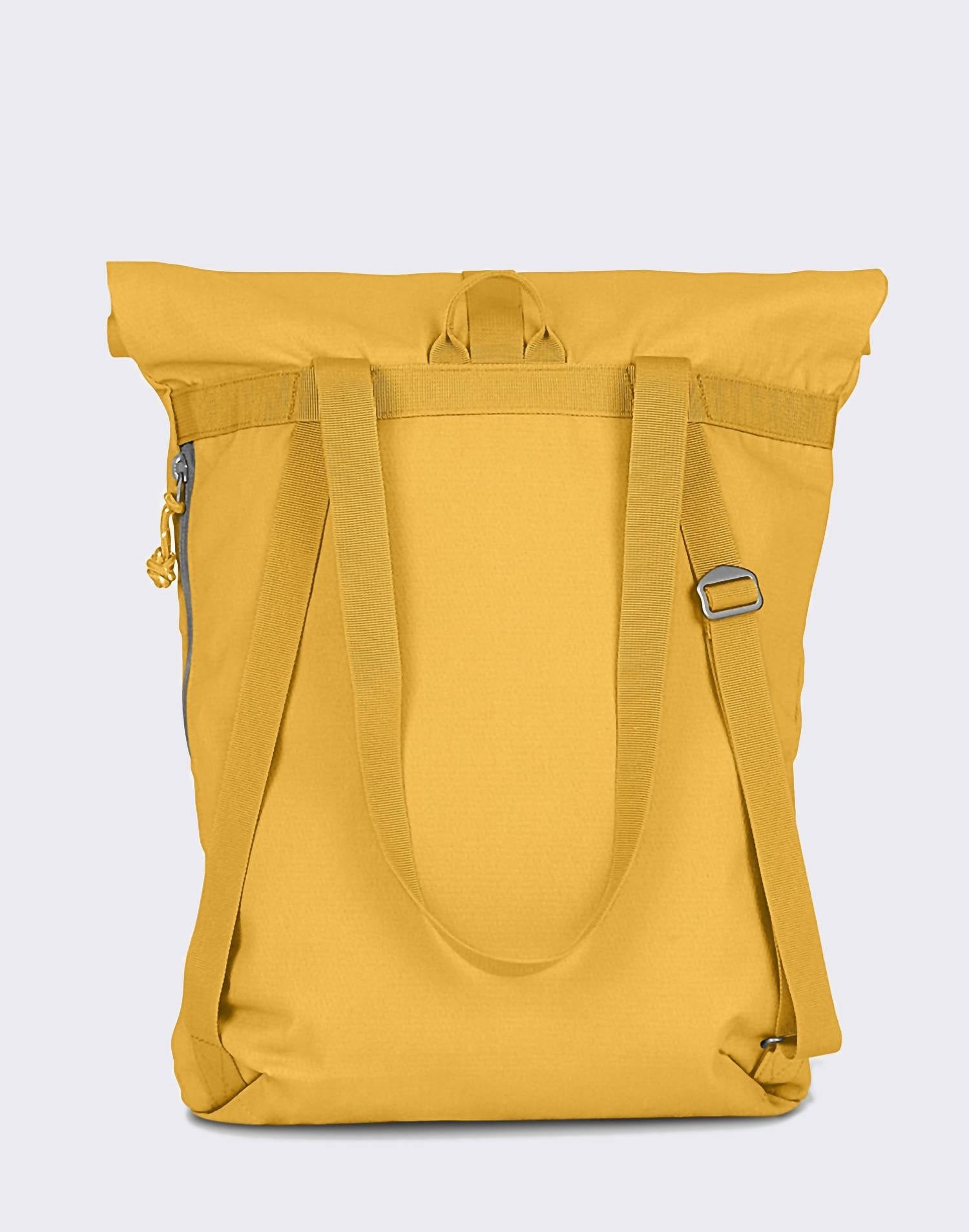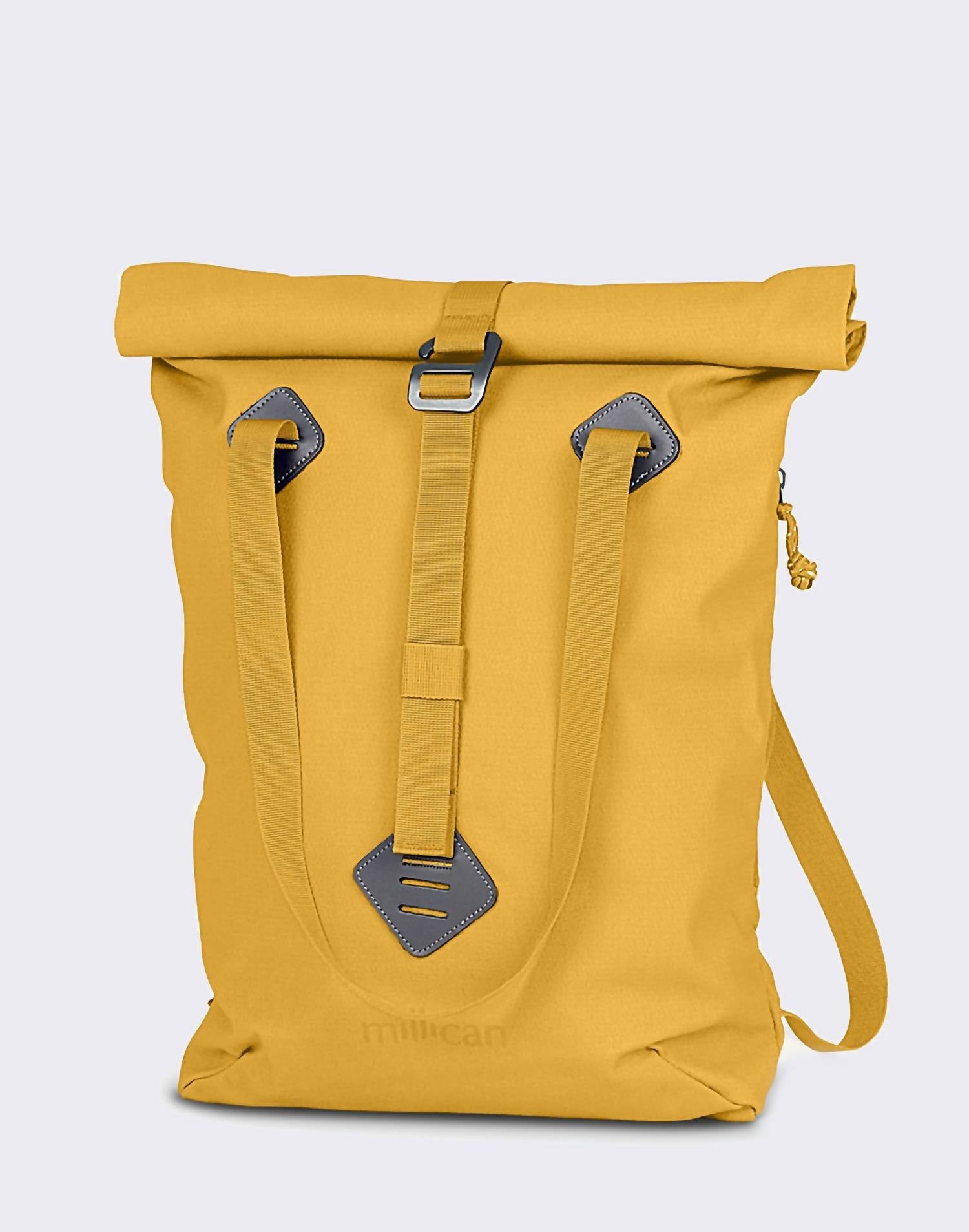 The Millican Tinsley Tote Pack 14L in Gorse is a versatile and functional accessory, designed to be used as either a handbag or backpack. Crafted with 57% recycled polyester, 38% cotton, and 5% polyester, this tote pack combines sustainability with durability, featuring a polished waterproof finish. It includes a practical roll-up fastening, an inner pocket and compartment system, and a side zipper pocket with a key carabiner for convenience. The dimensions of 36 x 27 x 11 cm and a weight of 650 g make it an ideal choice for everyday use, all within the minimalistic Maverick Collection.