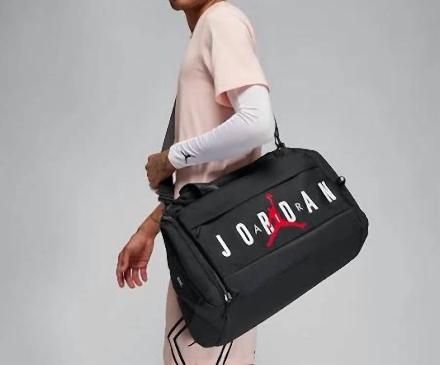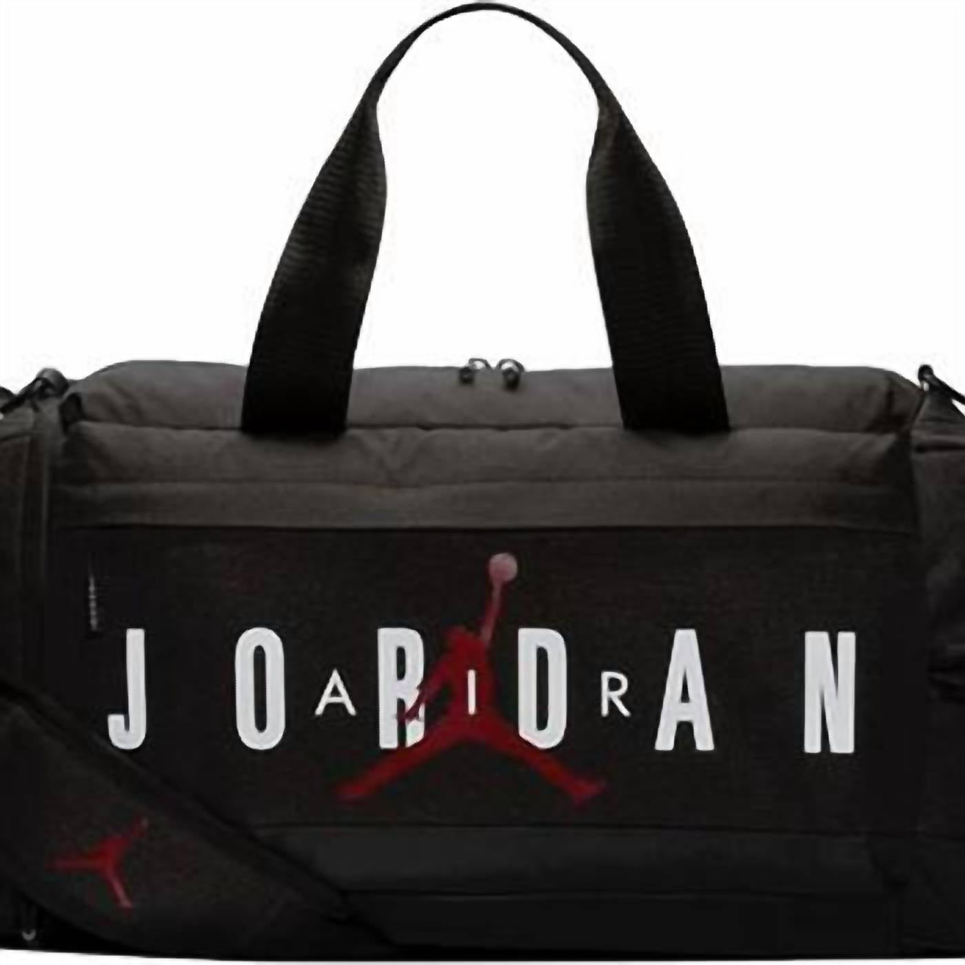 Nike Jordan Air Duffel Gym Duffel bag (Black) Capacity: 10.25"H x 21.5"L x 13"D; Strap Length: 51" (longest), 31.74" (shortest) Spacious Storage: Large main compartment with dual-zip closure provides secure and easy access to all your gear. Organized Design: Interior drop pocket helps keep small items like keys, phone, or wallet in one place. Dedicated Shoe Garage: Side compartment keeps shoes or used gear separate to maintain cleanliness inside the bag. Durable & Versatile: Built with sturdy materials and adjustable strap options, making it ideal for training, travel, or everyday carry. Description Take everything you need with ease, whether you are heading to the gym, traveling for a game, or packing for a quick trip. This versatile duffel offers a roomy main compartment with a smooth two-way zip closure for secure access, plus an interior drop pocket that keeps small essentials within reach. A dedicated side shoe compartment separates footwear from the rest of your gear, helping you stay organized and keep clean items fresh.