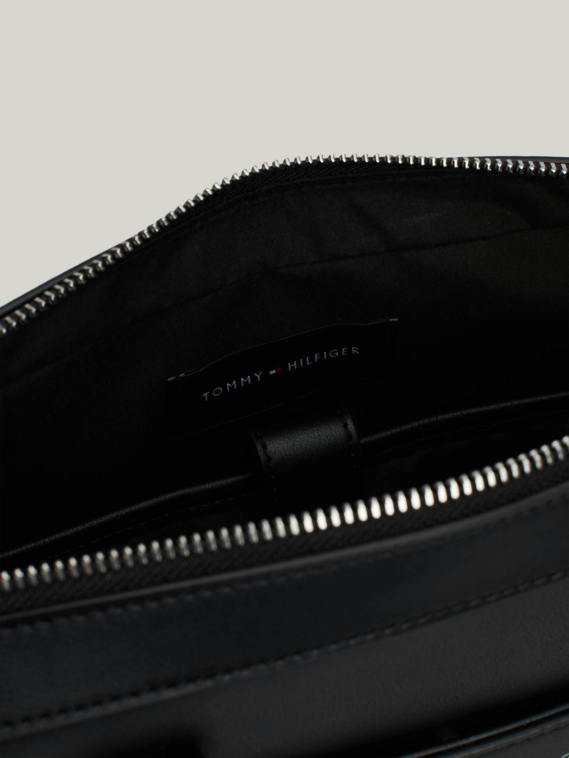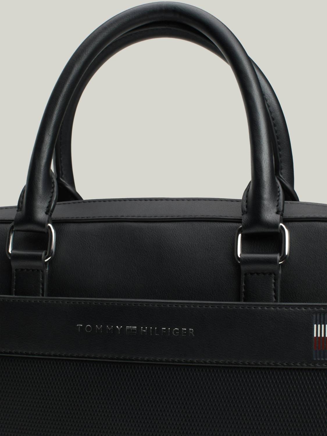 Elevate your tech commutes with the Men's Textured Logo Computer Bag by Tommy Hilfiger, a sleek laptop bag in classic black. Crafted from 100% polyurethane, this bag features a protective padded sleeve for your laptop and mixed texture panels for a refined look. A zip closure secures the main compartment, complemented by two top handles and an adjustable removable crossover strap for carrying versatility. Dimensions are 38.1 x 6 x 28 cm, with a capacity of 6.4L, ensuring ample space for your tech essentials.