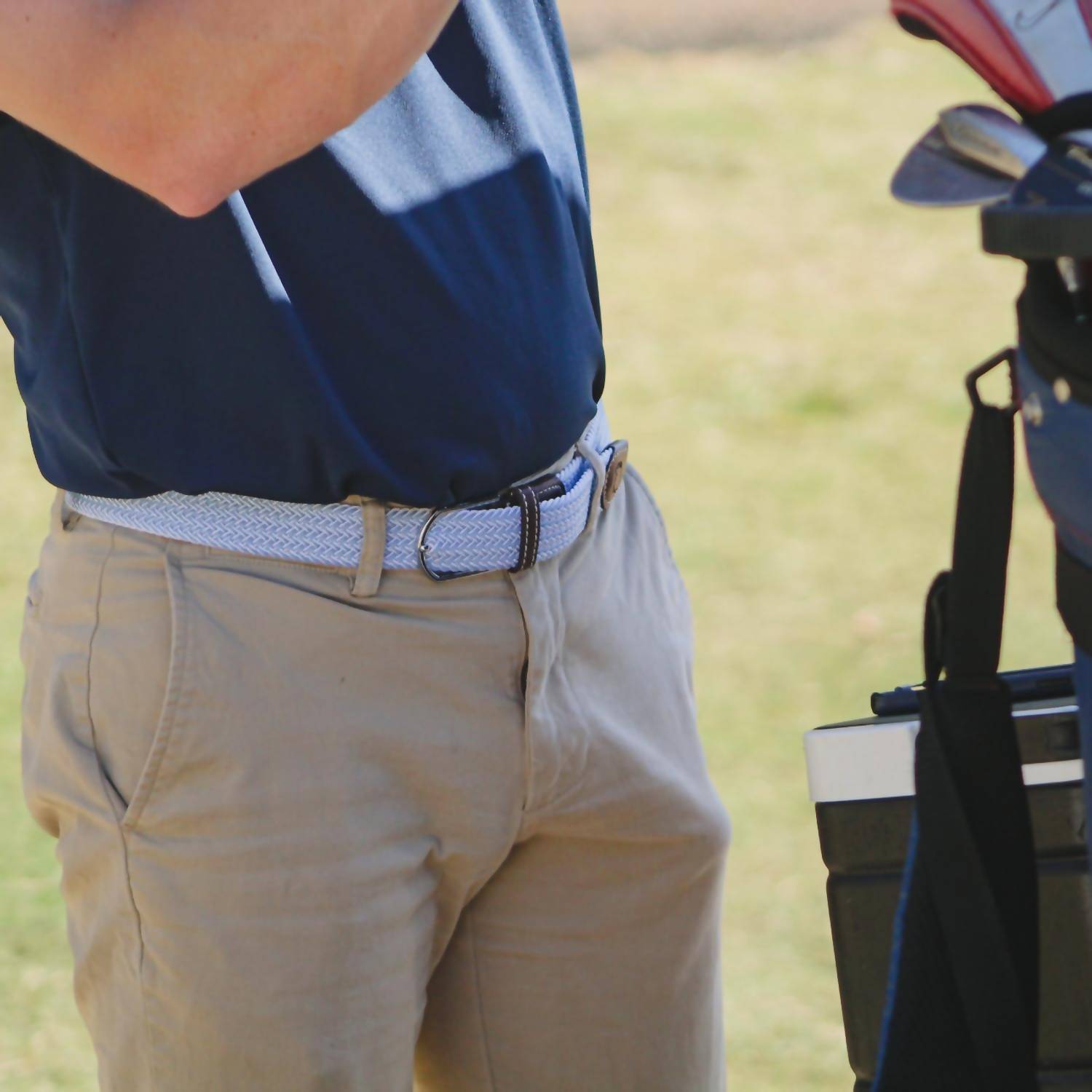 Discover the Men's Sarasota Woven Elastic Stretch Belt by Roostas, a perfect blend of style and functionality. Crafted from 60% Polyester and 40% Rubber, this belt features a two-toned herringbone design in White and Sky Blue. The 3.2cm wide belt is finished with a dark brown leather and alloy zinc rounded buckle, showcasing the Roostas logo. With an adjustable clasp, it offers adaptable sizing, available in sizes Small (26 - 32"), Medium (33 - 38"), and Large (39 - 46").