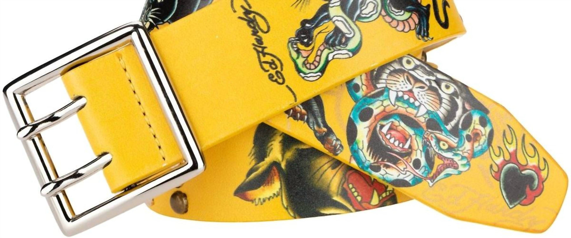 Complete your streetwear ensemble with the Men's Panther Snake Belt by Ed Hardy. This yellow belt showcases distinctive printed graphics and is adorned with studs for a bold statement. It features a sturdy metal buckle for easy adjustment. Embrace the iconic Ed Hardy brand with this stylish accessory, effortlessly tying your look together.