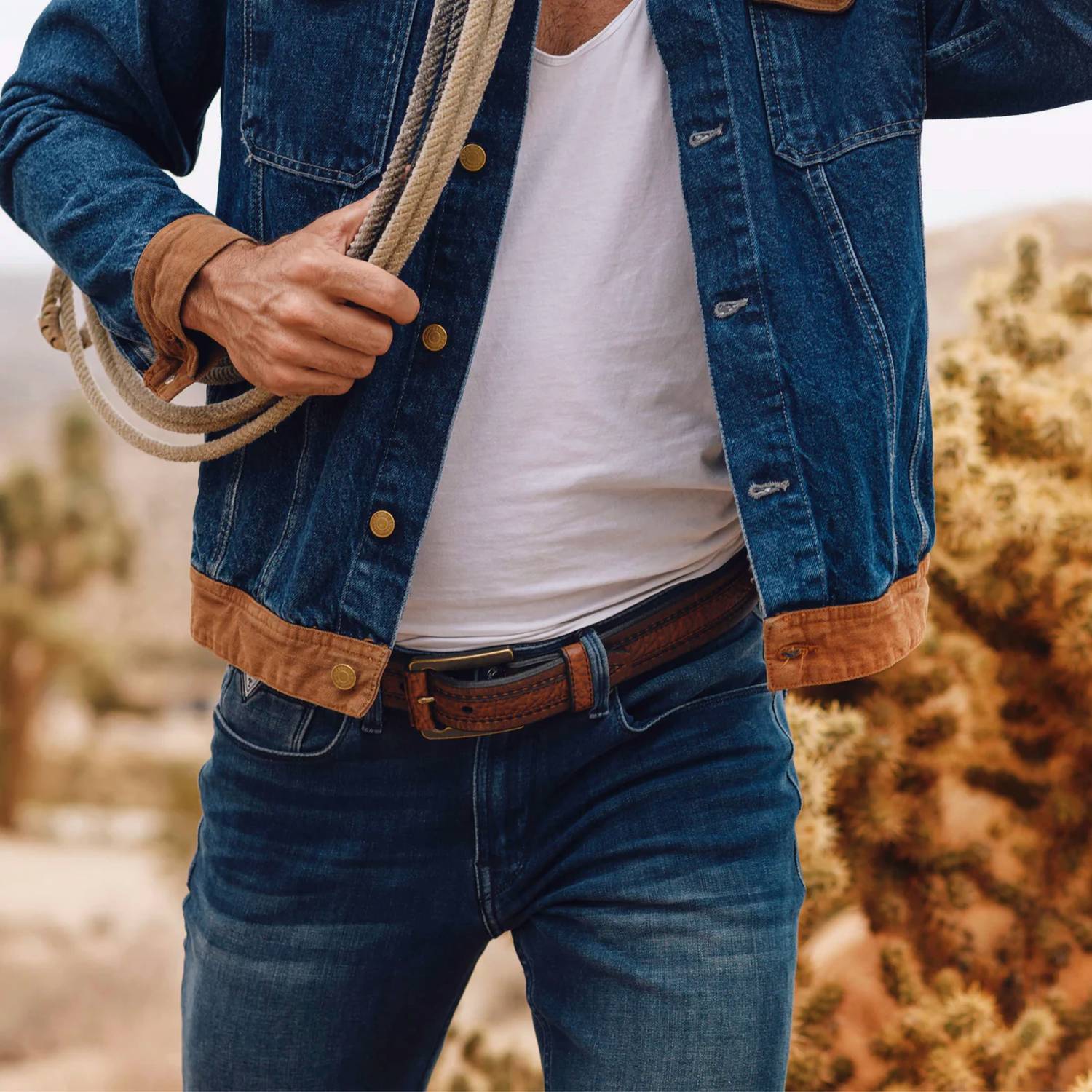 Experience the craftsmanship of Lejon Leather Goods with the Men's Vintage Bison Chippewa USA Belt in Saddle/Peanut. Crafted from American bison leather, this belt exudes a rich, pull-up quality created from natural tanning processes. It features a contrast center overlay and a leather-wrapped antique brass buckle for added style. The belt has a width of 40 mm (1.57 inches), with five belt holes spaced an inch apart, and includes a convenient snap enclosure for easy buckle swapping. Origin: Made in the USA.
