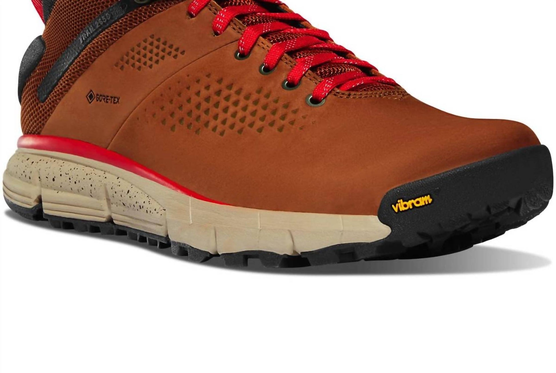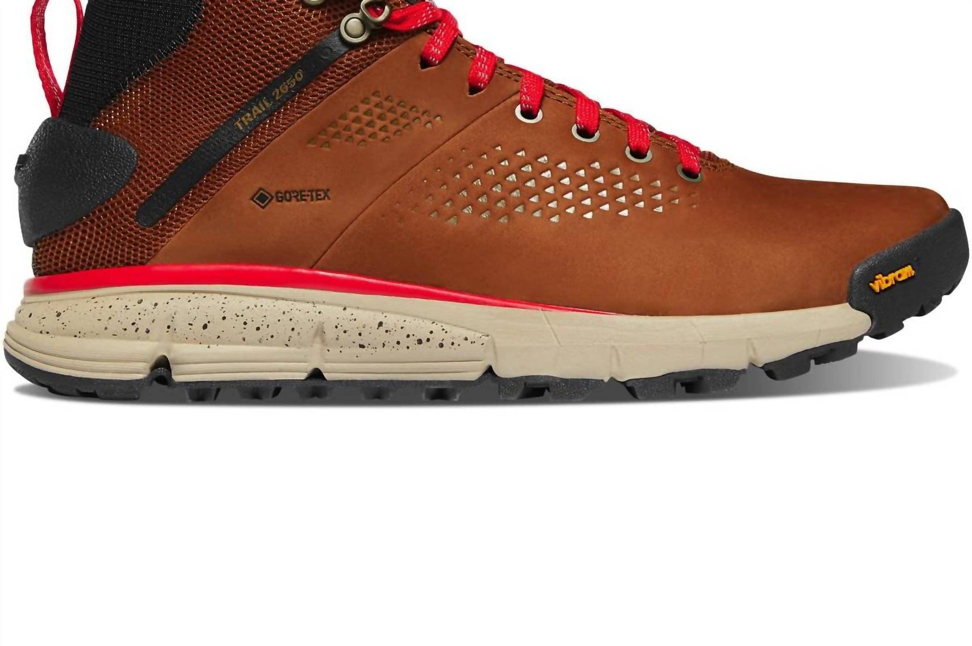 Discover the Men's Trail 2650 Mid 4" Hiking Shoes by Danner, crafted for adventurous camping expeditions. These mid-top hiking boots boast a durable suede and lightweight textile upper, enhanced by a 100% waterproof, breathable Gore-Tex liner to keep your feet dry. Featuring an OrthoLite footbed for superior cushioning, a Plyogo midsole for excellent lightweight support, and an EXO Heel System for a secure, comfortable fit. Ideal for summer athleisure trends, these round-toe boots in Brown/Red GTX are built for top performance.
