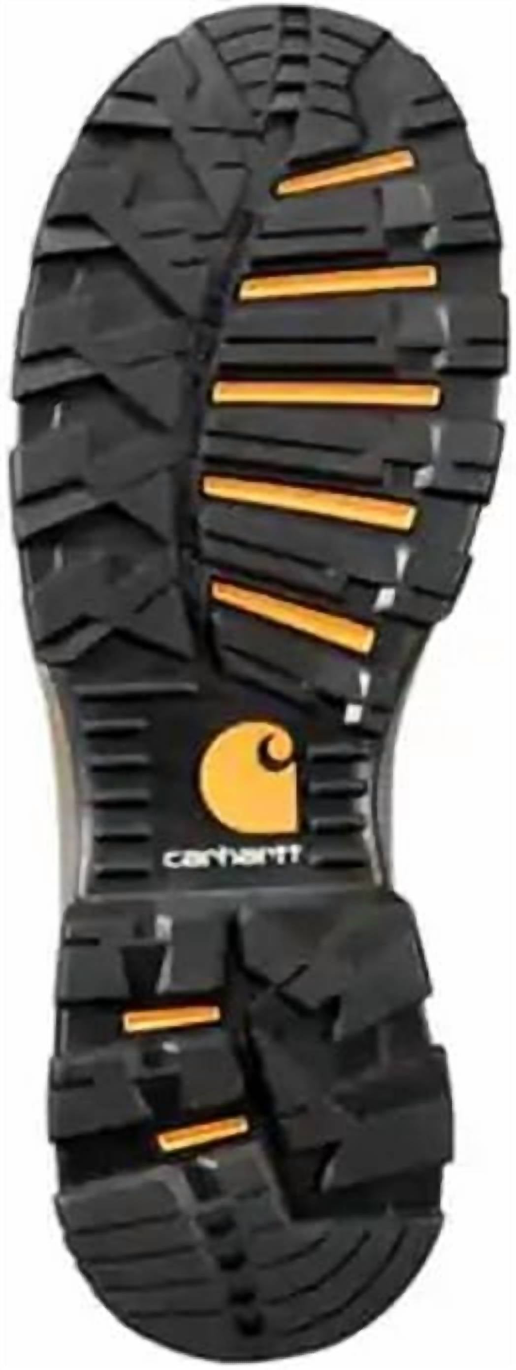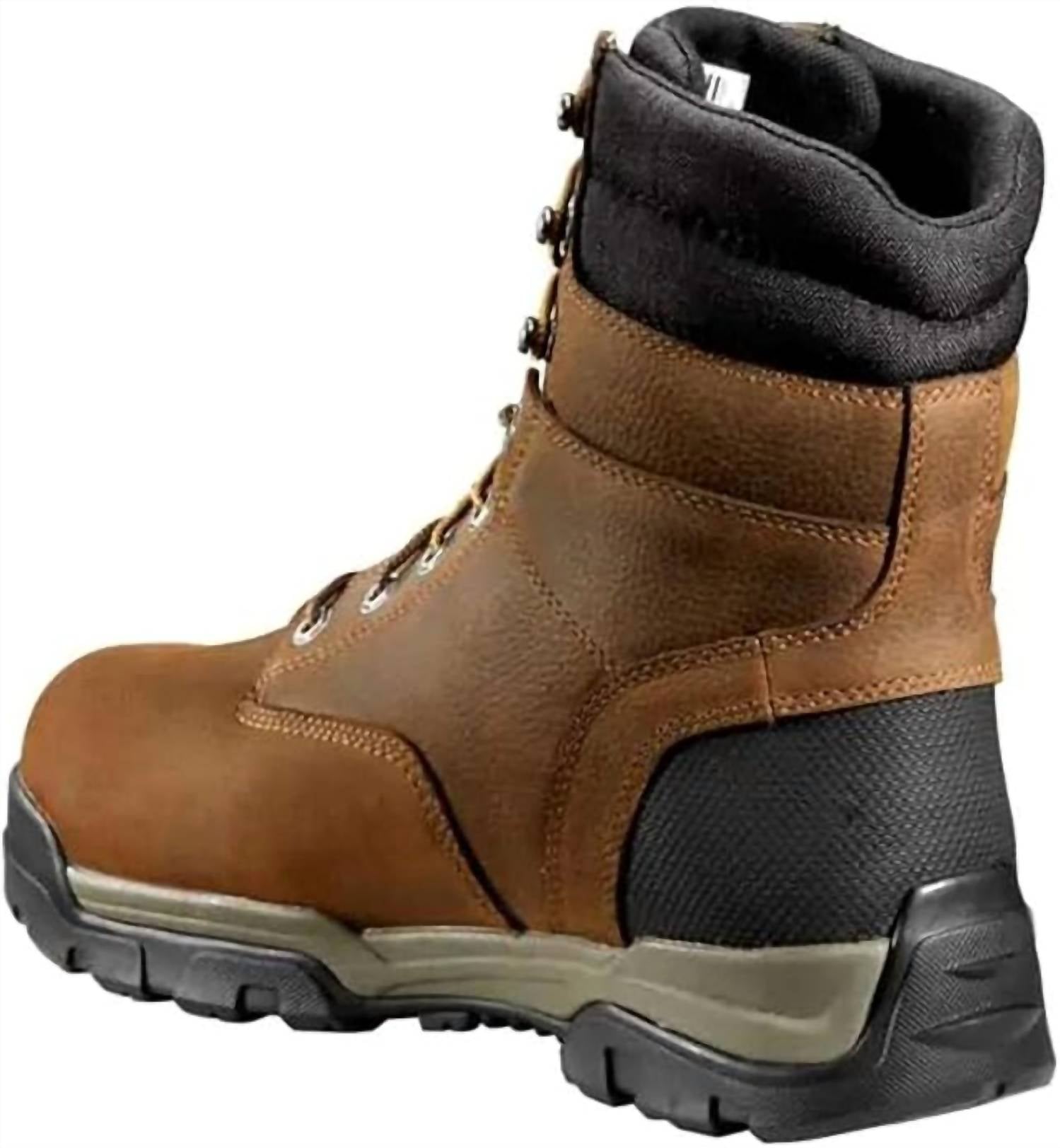 Introducing the Men's Insulated 8" Soft Toe Work Boots by Carhartt, crafted for rugged reliability in brown. These boots feature oil-tanned leather with a lace closure and a sturdy rubber material for enhanced durability and comfort. The 8-inch design offers exceptional protection while the 600g 3M™ Thinsulate™ insulation and Storm Defender® waterproof breathable membrane ensure warmth and dryness. With a cement-constructed Ground Force rubber outsole for superior grip and traction, these boots are imported and meet ASTM F2892-18 EH standards.