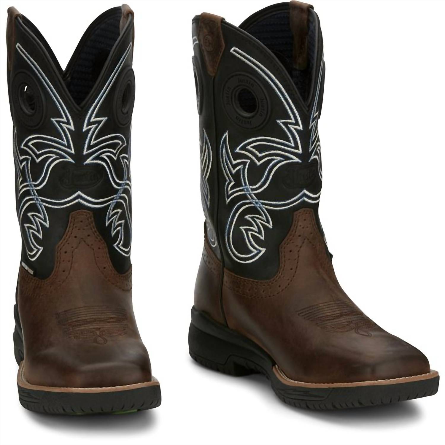 Introducing the NiTread Waterproof Toffee Boot by Justin Boots, crafted with premium full-grain leather for enduring style and resilience. These boots feature a squared toe and chunky low heel, making them an ideal choice for comfort and stability. With a high-tech design, the oil and slip-resisting rubber outsole ensures safe traction, while the N2Genâ„¢ technology deadens shock and reduces foot fatigue. Perfect for long wear, these boots meet ASTM F2892 safety footwear standards, ensuring reliability on any terrain.