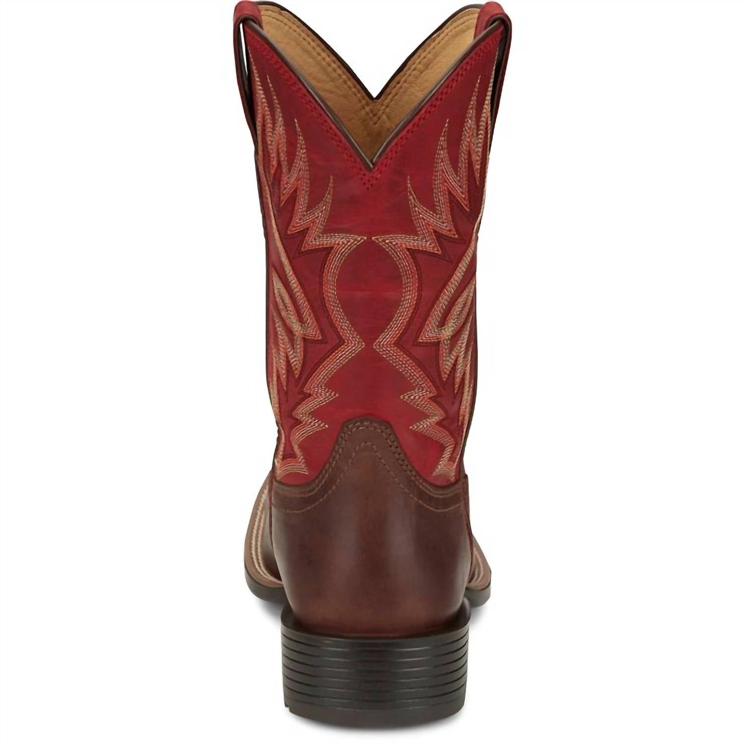 Experience the perfect blend of style and comfort with the Men's 11" Zeke Wide Square Toe Boots by Justin Boots. Crafted from high-quality leather, these cowboy and western boots in a striking brown and red colorway are designed for the modern man. Featuring a squared toe and an X-wide fit, these boots ensure ample room and a comfortable wear. The low block heel measures 1.50 inches, providing the ideal balance of height and stability for everyday adventures.