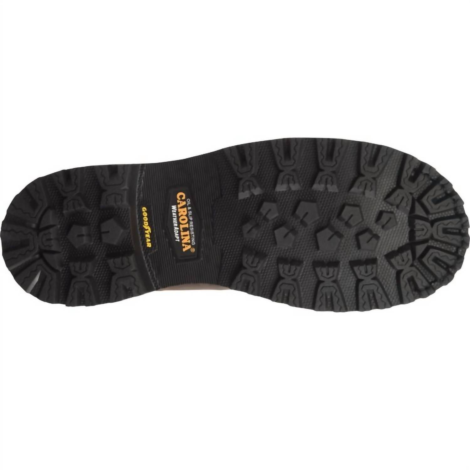 Experience durability and protection with the Men's Pitstop 8" Composite Toe Work Boots by Carolina. Crafted using a rich Saddleback Dark Brown Barnyard Acid Resistant Leather, these boots are equipped with a Carbon Composite Safety Toe Cap and a waterproof SCUBALINER™ to keep your feet dry. They feature a breathable mesh lining and an OVERTIME™ Comfort System Footbed for all-day comfort. Thanks to the oil and slip-resistant GOODYEAR Weather Adapt Rubber Outsole and Tripleflex Technology Welt Construction, these boots offer reliable traction and support.