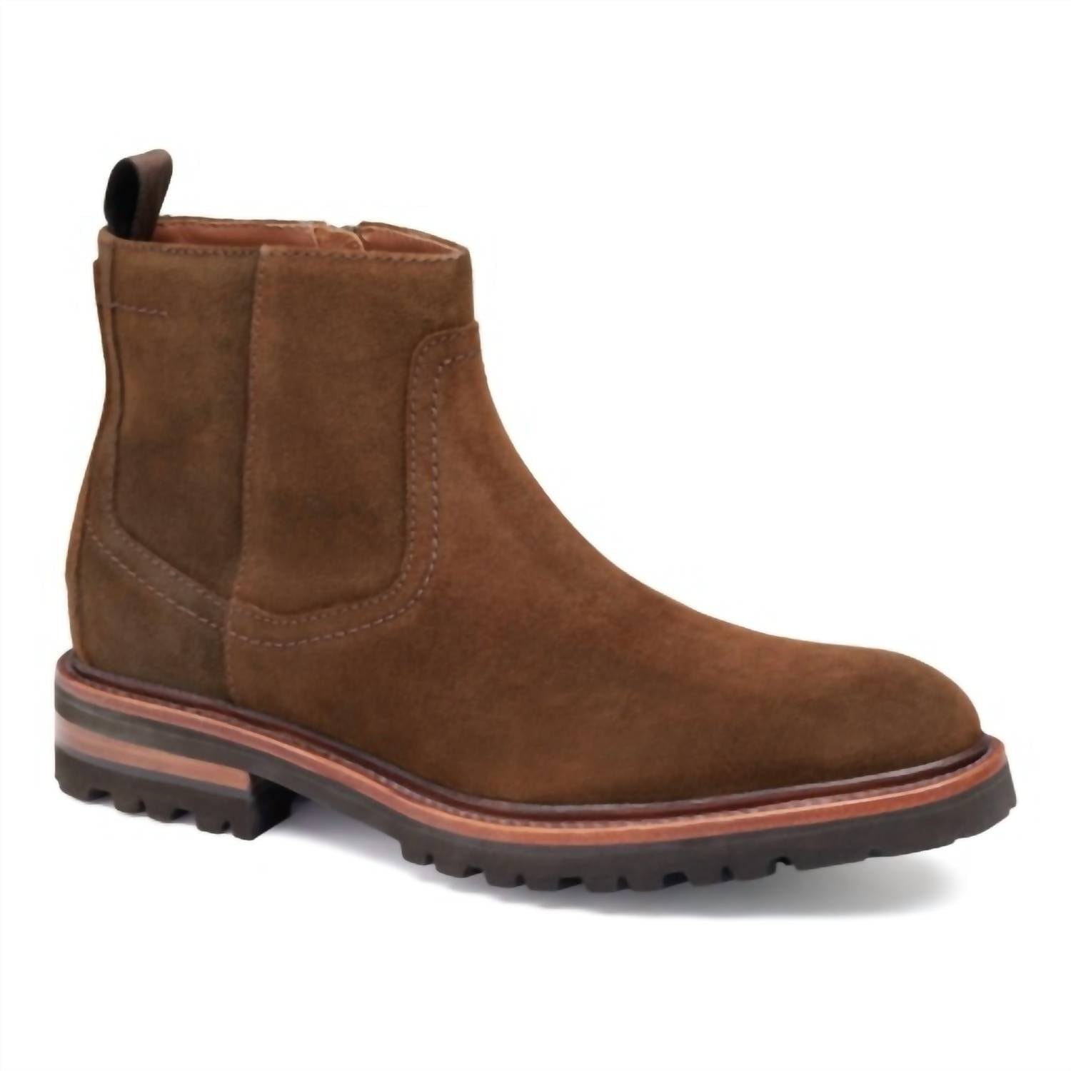 Discover the Men's Dudley Lug Zip Boot by Johnston & Murphy, crafted from the innovative Wet-Green leather, renowned for its environmental friendliness. This brown waxed English suede boot showcases genuine Goodyear welt construction for exceptional durability, while the inside zip ensures easy wear. The boot's leather lining and cushioned leather-covered footbed provide comfort, and a heel pull loop adds a functional touch. With its round toe design, this boot is a perfect fit for engagement occasions or workwear, making it an ideal choice for the fall season and Thanksgiving holidays.