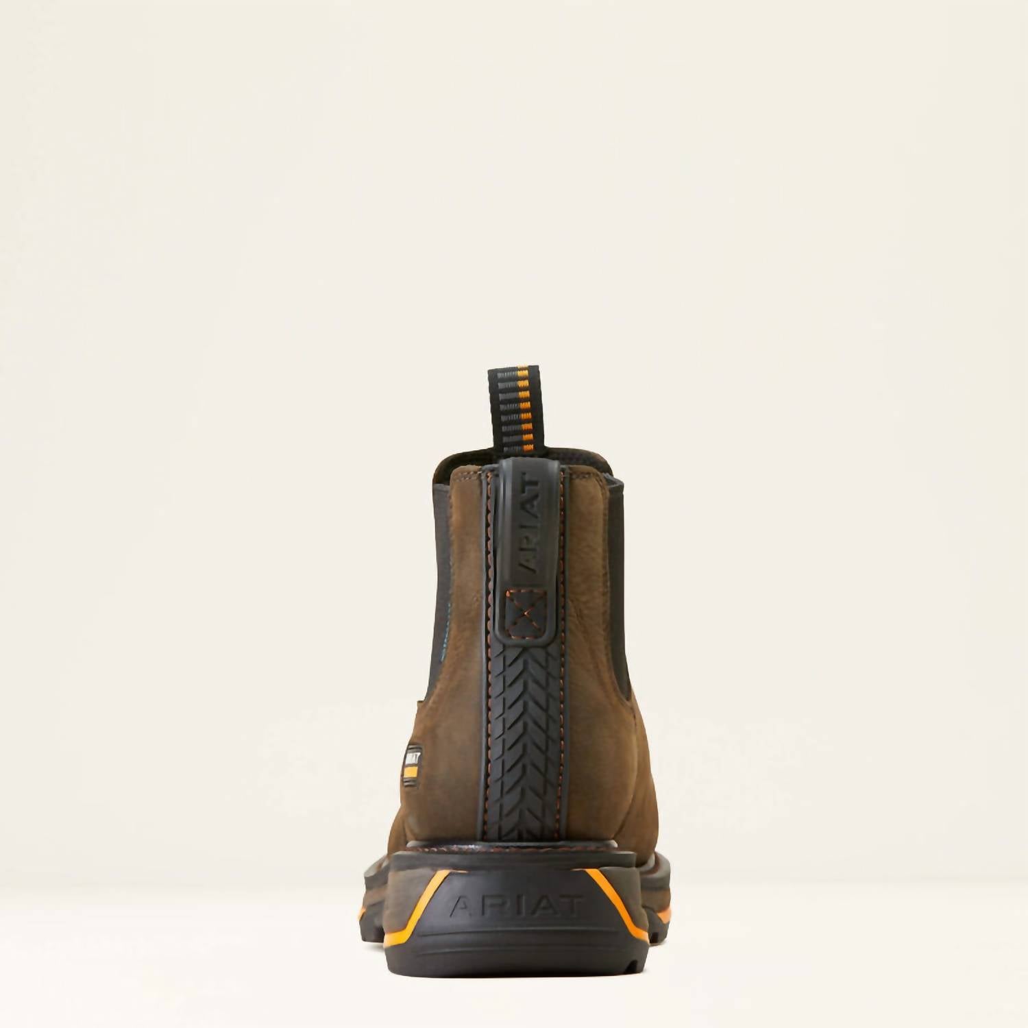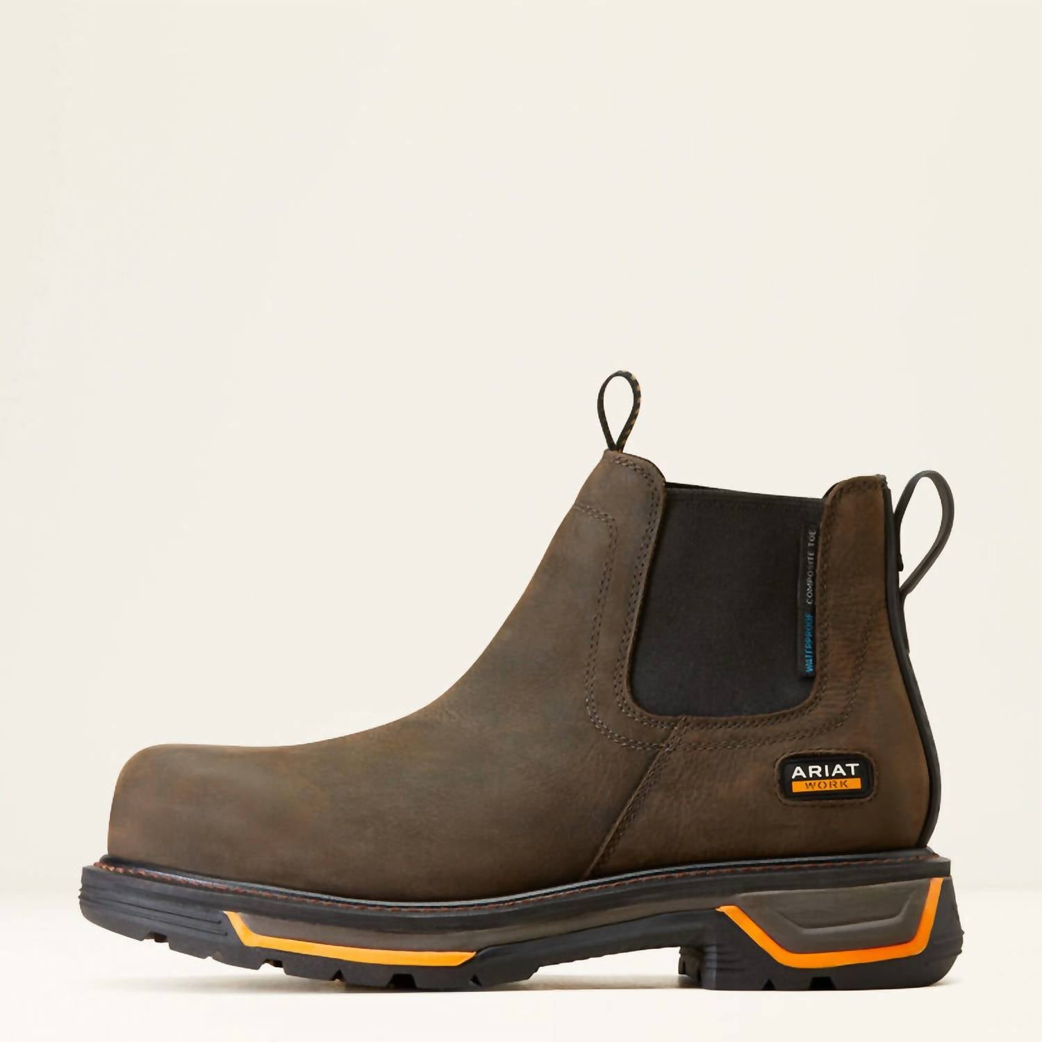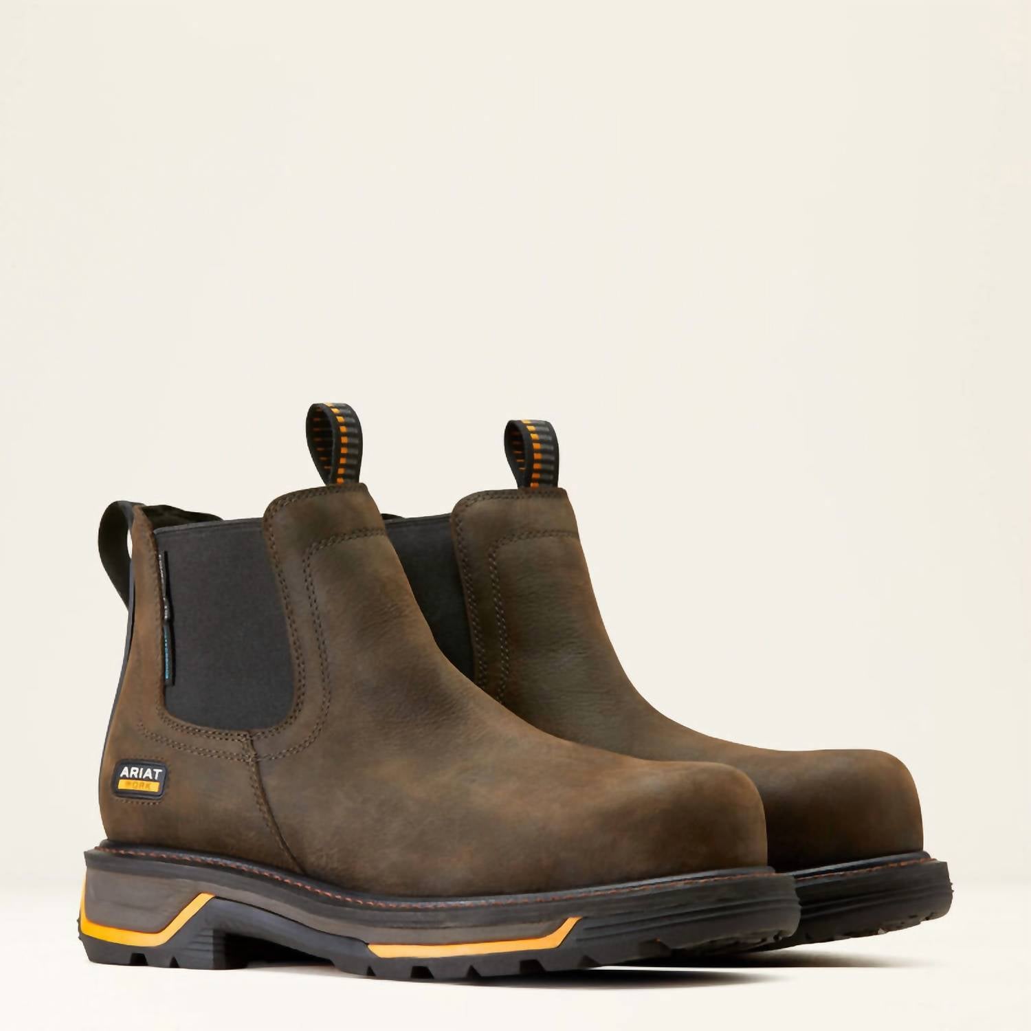 The Men's Comp-toe Big Rig Chelsea Work Shoe by ARIAT in Dark Brown offers unparalleled durability and support, highlighted by its resolable Goodyear welt construction. This boot features elastic twin gore and a back pull tab for easy wear, alongside a 90° heel for added stability. Equipped with ATS® technology and DRYShield™ waterproof breathable construction, it provides ergonomic support and protection on challenging terrains. The oil- and slip-resisting Duratread™ sole ensures maximum wear resistance, making it a robust choice for any work environment.
