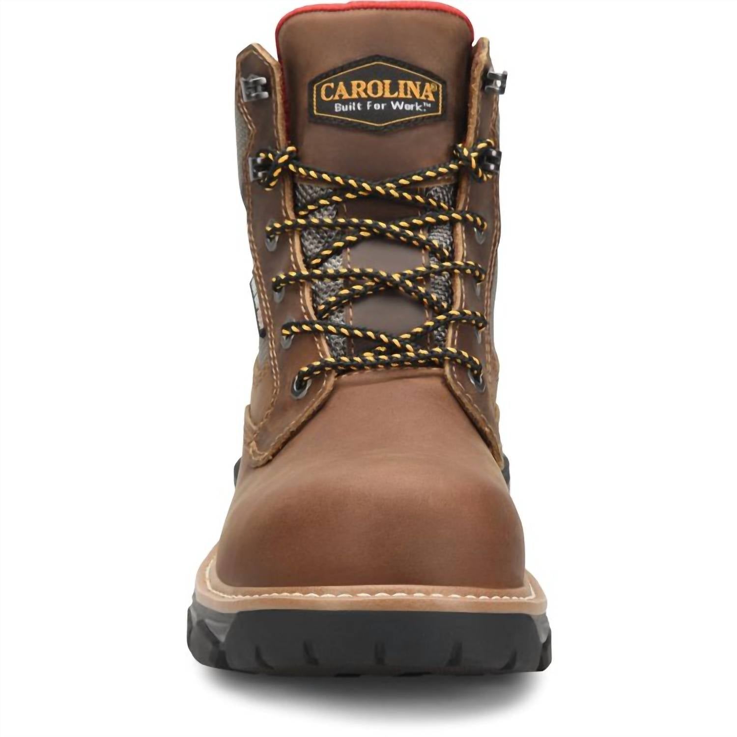 Introducing the Men's Cancellor 6" Waterproof Work Boots by Carolina, crafted for ultimate protection and comfort. These boots feature a brown Buggywhip Hazel Leather upper with a reliable composite safety toe cap. They are designed with the innovative Waterproof SCUBALINER™, mesh lining, and a removable AG8 Polyurethane dual-density foam footbed for added comfort. Enhanced stability is achieved with a triple-rib steel shank and TPU heel stabilizer, while the oil and slip-resisting rubber lug outsole ensures secure footing in various conditions.