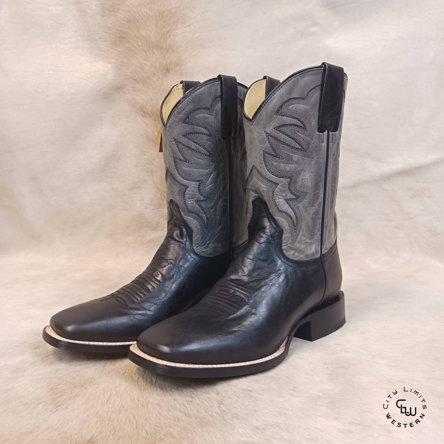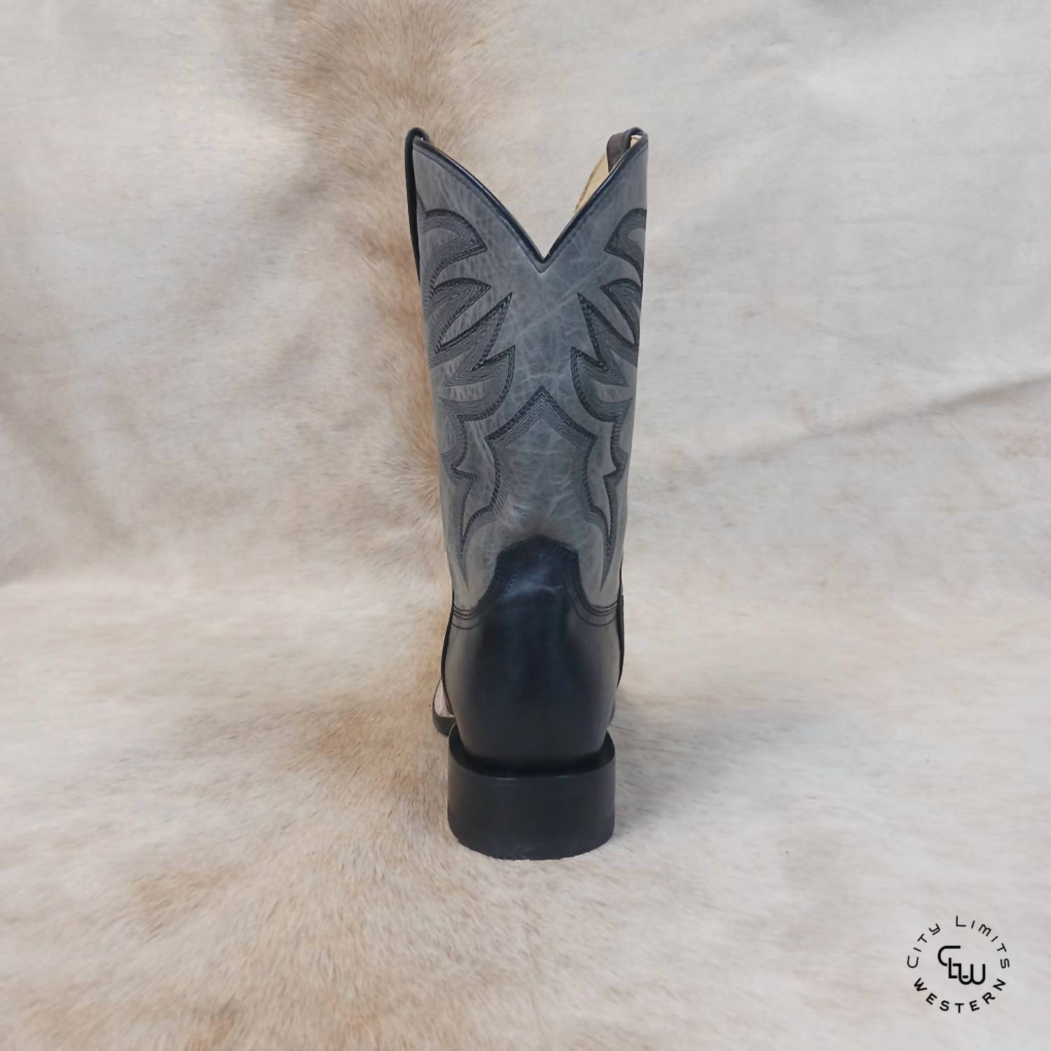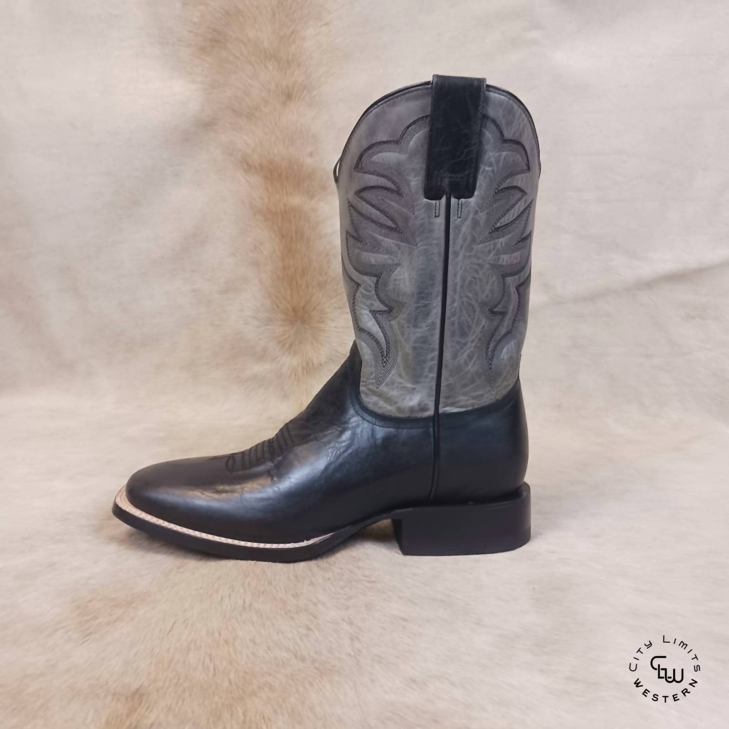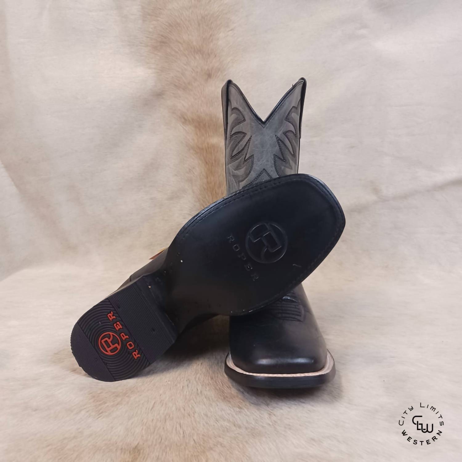 Introducing the Men's Parker Square Toe Boot by ROPER, a distinctive addition to any young gentleman's wardrobe for those special occasions. Crafted with a waxy black leather vamp and a waxy grey leather shaft, this boot is both stylish and durable. It boasts an 11" shaft, a double welt, and a leather walking heel, perfect for dinner parties or Western-themed events. Designed with all-leather lining and a REST removable insole, this boot offers comfort with quality. Ideal for summer festivities, let your little one step out in style with these unique boots.