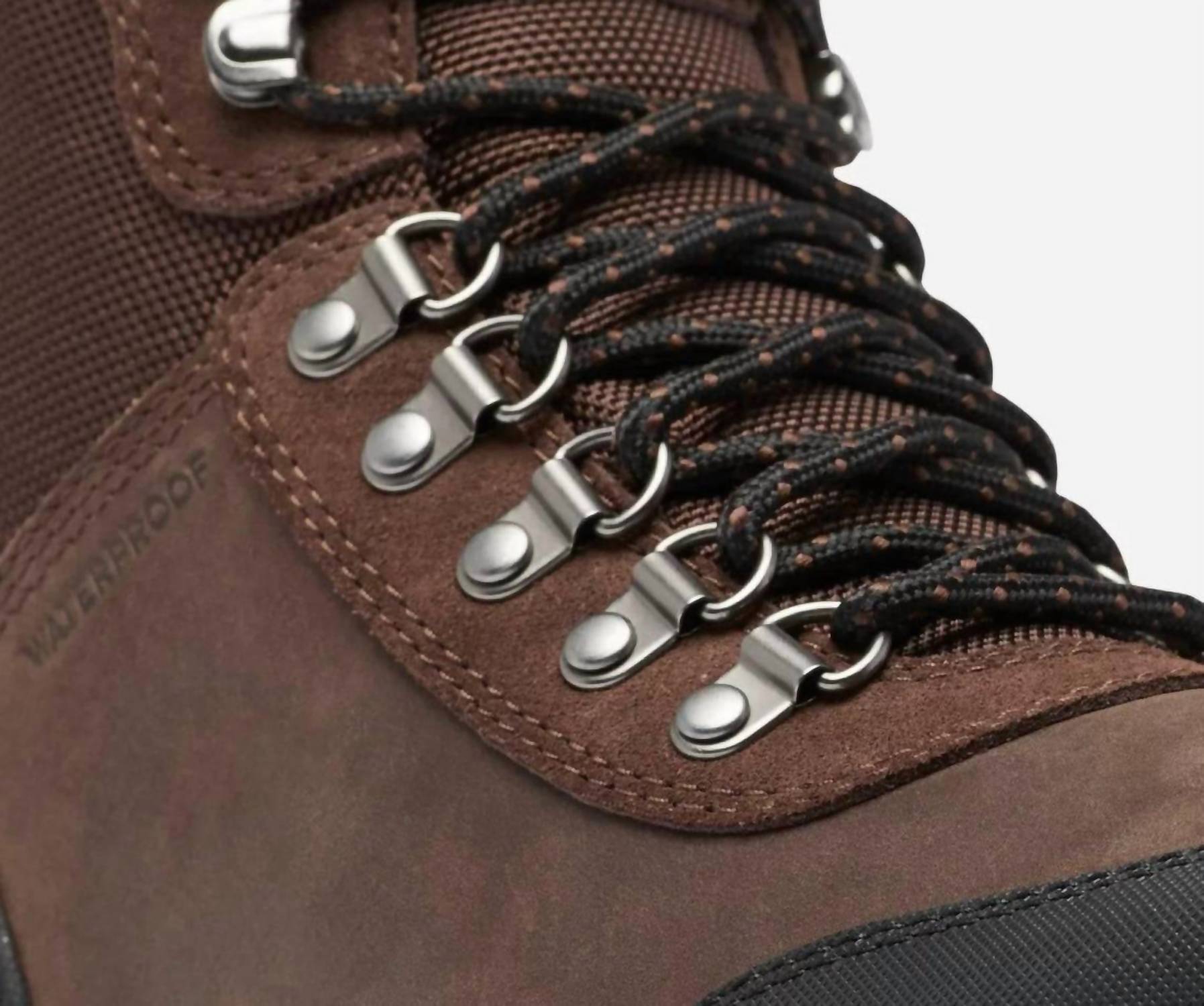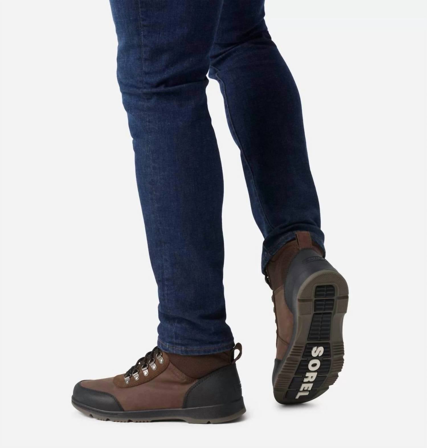 Meet the Men's Ankeny II Hiker Boot by SOREL, the perfect fusion of city style and outdoor function, presented in a sleek Tobacco Black. This boot features a waterproof design with a combination of full-grain leather and suede upper, complemented by metal hardware eyelets and a durable molded rubber outsole. With a comfortable 1/2-inch heel height, 100g insulation, and a seamless construction to keep your feet dry, it promises comfort and support in any weather. Care: Imported with a removable molded EVA footbed, this boot is ideal for both spring hikes and urban adventures.