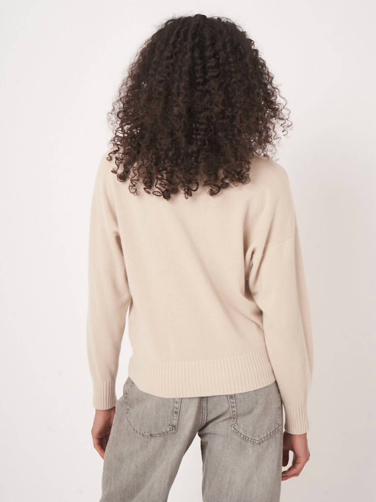 Wear this v-neck sweater with your favorite denim for the perfect fall look. Experience luxury with the Loose Fit Cashmere Sweater With Embroidered Pearl Trim from REPEAT cashmere, a standout piece in natural tone. This fine knit sweater features long sleeves with ribbed cuffs and a classic polo neck equipped with a placket for a polished look. Its 100% Organic GOTS-certified cashmere composition ensures unmatched softness and sustainability, paired with a loose cut and drop shoulders for a relaxed fit. Dimensionally, it offers a width of 54.0 cm and length of 58.0 cm, making it an ideal choice for those who appreciate comfort and style. Closure is pull-on, and it's best maintained by hand washing, with dry cleaning as an option. Model wears size 36/XS, height 1.78m.