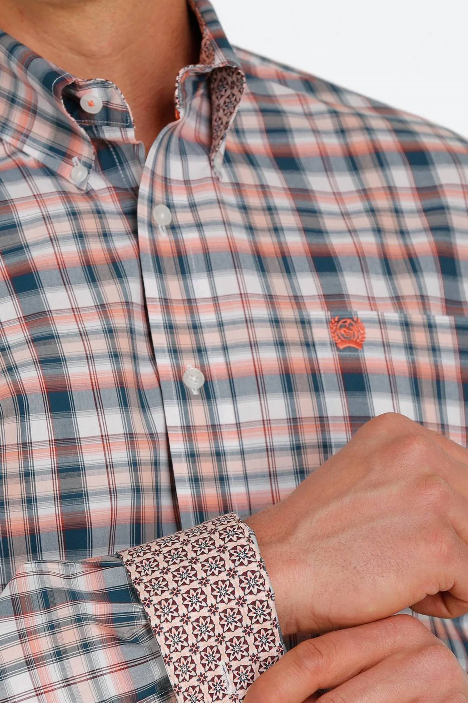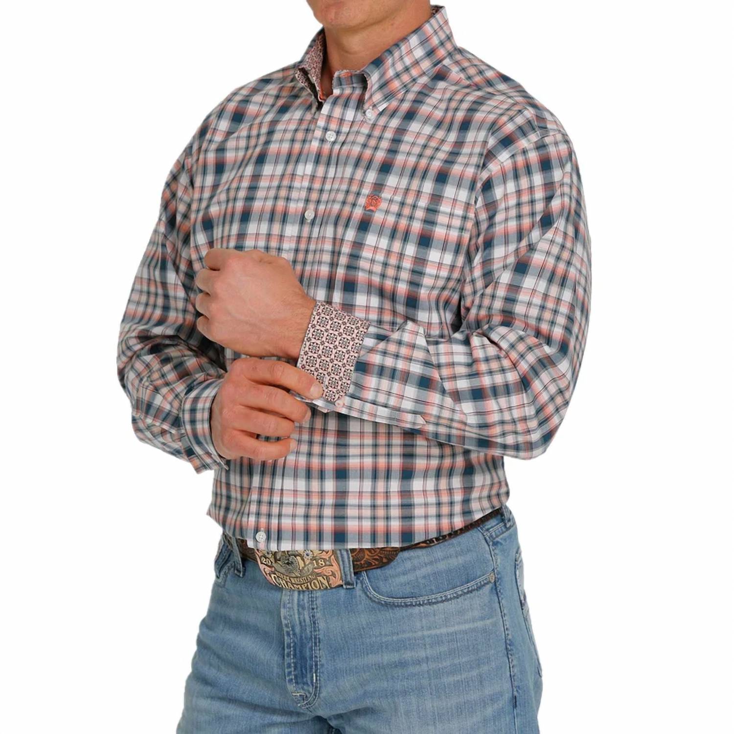 Introducing the Plaid Button-down Western Shirt by CINCH, a vibrant addition in White, Teal, and Coral that embodies modern Western style. This casual shirt features long sleeves and a button-down collar, with distinctive geometric floral cuffs and collar. Made from 100% cotton, it falls below the waist and boasts a curved hem and adjustable cuffs. Closure: Button closure. Care: Machine wash. The shirt includes a left open front chest pocket with an embroidered logo, offering both style and functionality.