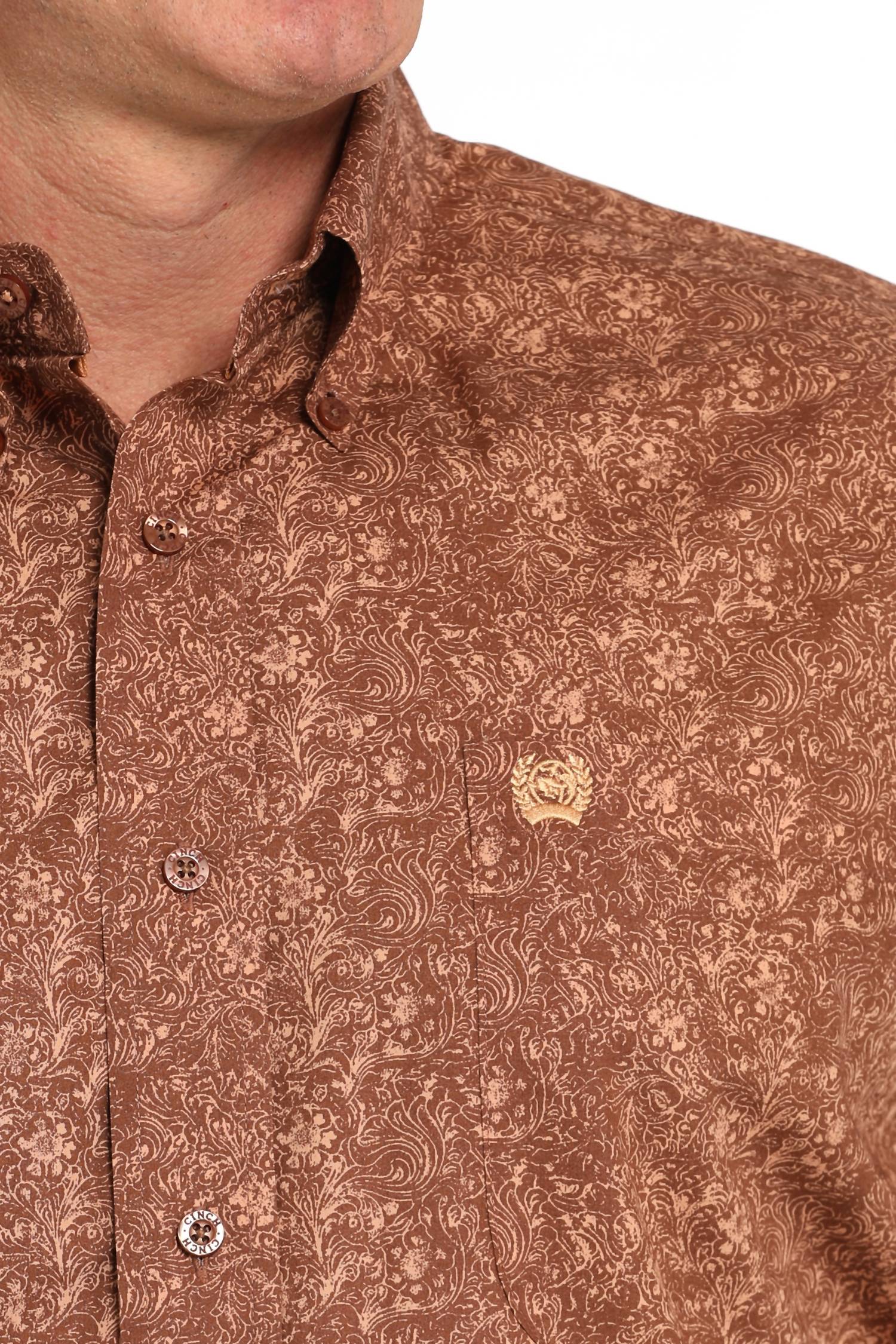 Introducing the Men's Rust Paisley Long Sleeve Shirt by CINCH, a stylish addition to your casual wardrobe. This shirt features long sleeves and a classic paisley pattern in a natural rust hue. Complete with a collar and open left front pocket, it embodies timeless style and functionality. Closure: Button closure. Perfect for pairing with jeans and boots, this piece is ideal for holiday parties and spring outings.
