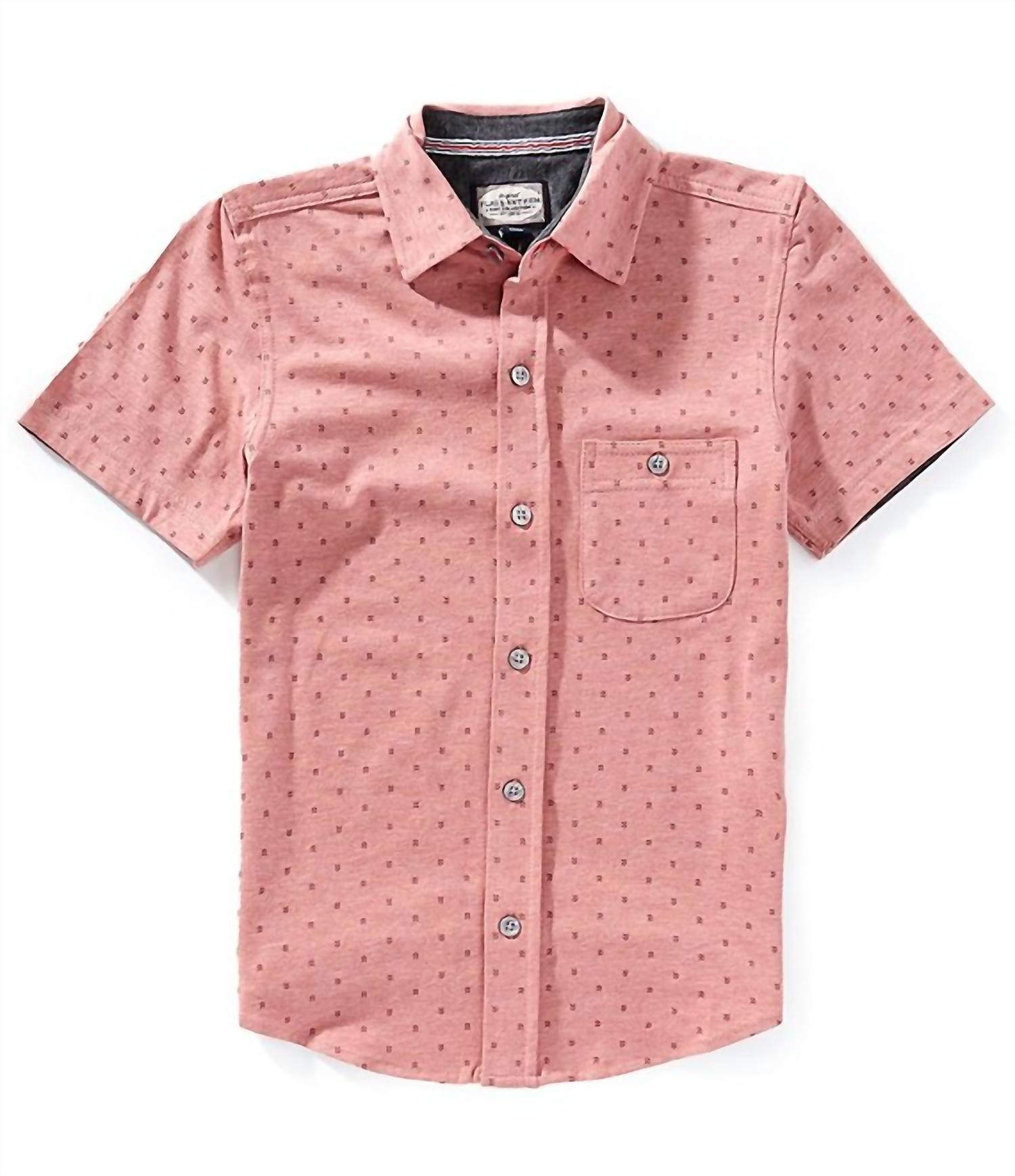 Discover the Fulton Short Sleeve Geo Print Shirt by Flags & Anthem, an ideal choice for a polished, yet comfortable look. Made from quality cotton, this patterned coral shirt features a tailored athletic fit and short sleeves, perfect for spring occasions. Enhanced by contrast fabric inside the collar stand, back yoke, front placket, and sleeve cuffs, it offers a touch of distinctive style. Closure: Button closure. Care: Machine wash, tumble dry. With a body length of 29.5” in size medium, it’s perfect for both tucked and untucked styles.