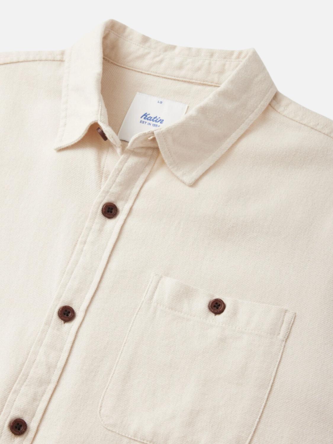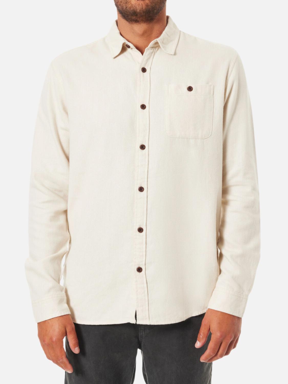 The Katin Twiller Flannel Shirt in Vintage White offers a sophisticated yet casual look with its long sleeves and button closure. Crafted entirely from lightweight 100% cotton, this flannel showcases a distinct 2-tone twill weave and brushed finish for added smoothness. A single left chest button pocket adds functionality to the design. Unfortunately, specific care instructions are unavailable for this product. Ideal for both casual and holiday party settings, this shirt combines comfort and style effortlessly.