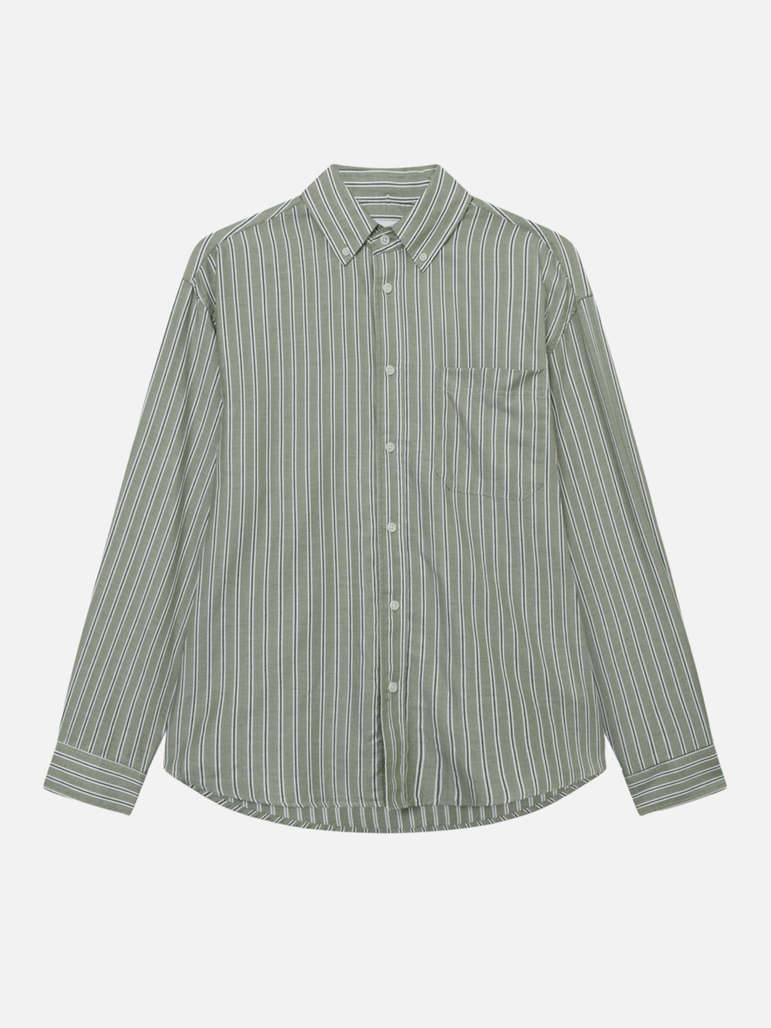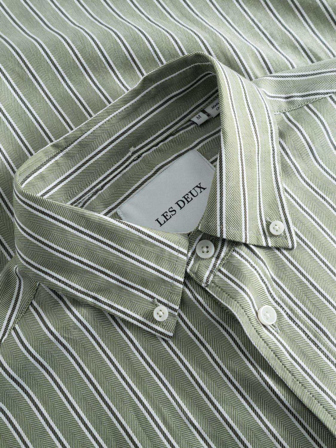 Presenting the Kolton Herringbone Poplin Shirt by Les Deux, a casual staple perfect for holiday parties with its short sleeves and classic style. Made from 100% cotton in a light herringbone poplin, this loose fit shirt showcases an off shoulder seam and a curved hem for an effortlessly relaxed look. The stripe pattern in white and chive green adds a heritage touch, while the button closure and button down collar complete its sophisticated design. Originating from an unspecified country, this piece stands out with its quality craftsmanship.