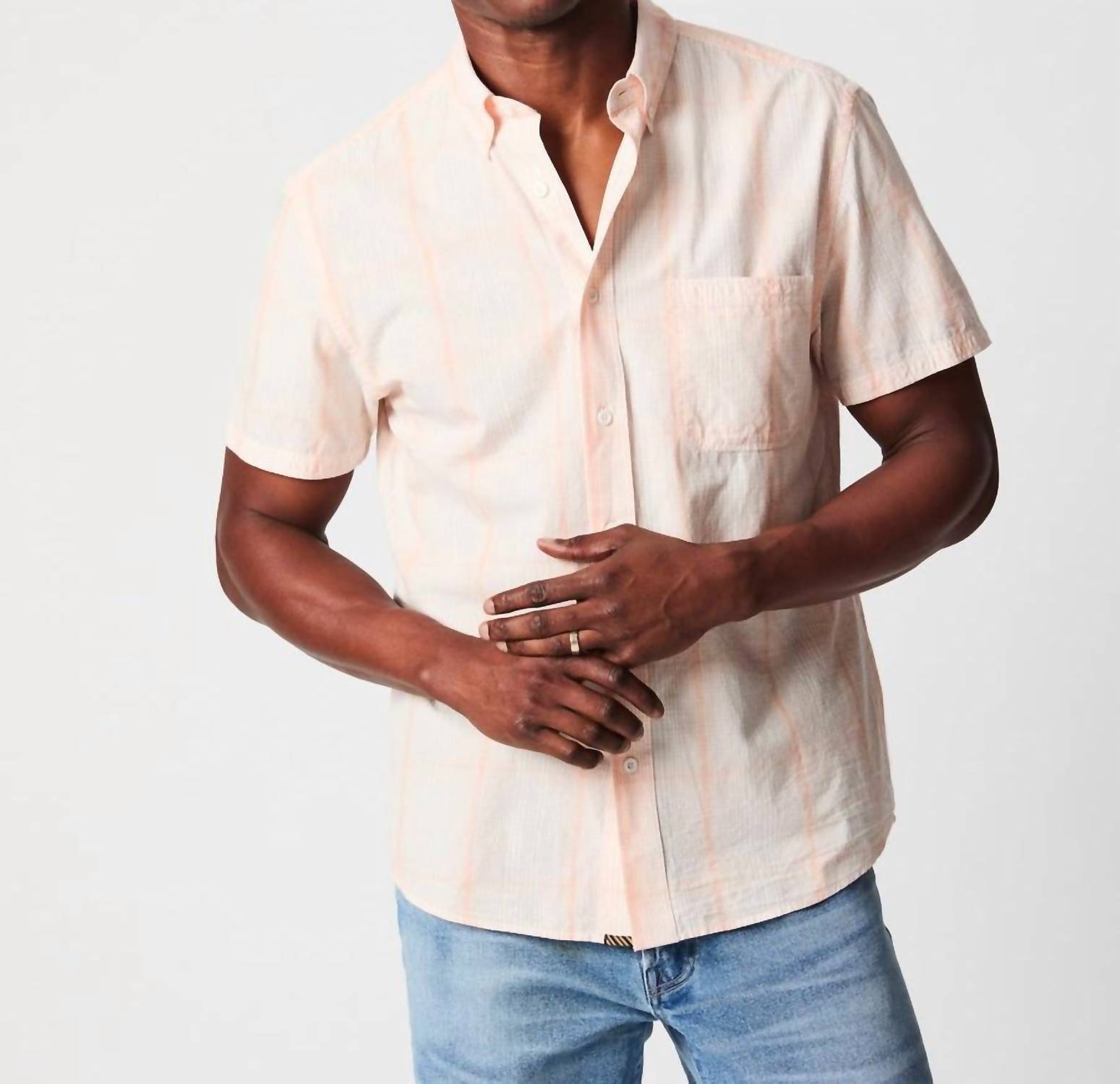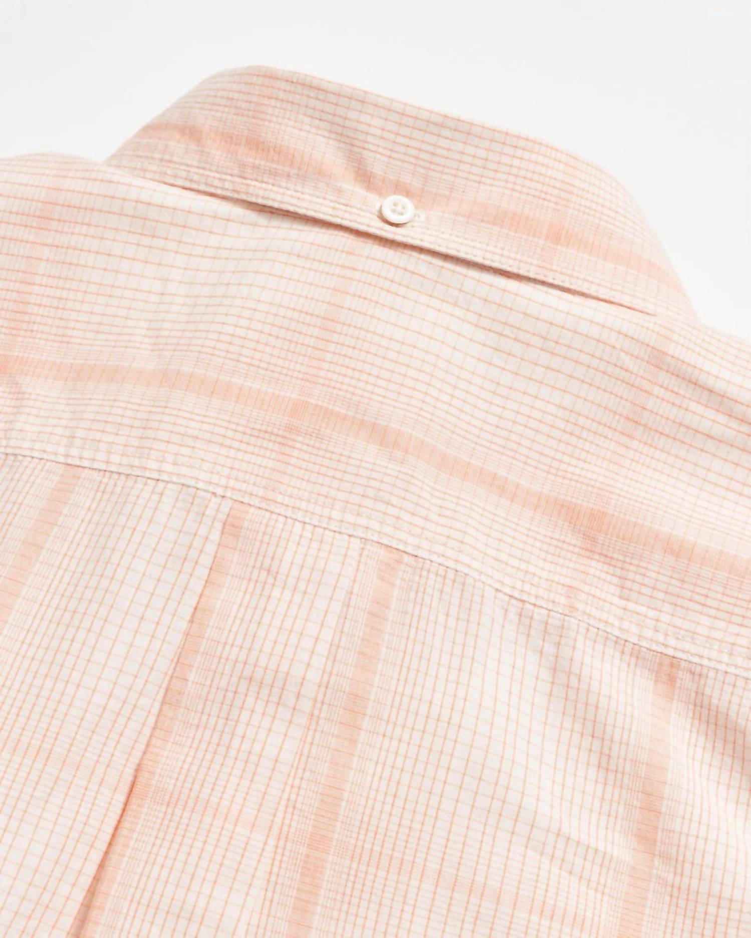 Experience the epitome of lived-in luxury with Billy Reid's Short Sleeve Button Down Shirt in Pale Coral. Crafted from 100% lightweight cotton, this standard-fit shirt boasts a custom line plaid design and includes a button-down collar along with its signature notch pocket and double-needle stitching. Originating from India, it's finished with genuine mother-of-pearl buttons and the distinguishing heirloom ribbon detail under the placket. Closure: Button closure. Care: Machine wash cold, tumble dry low.