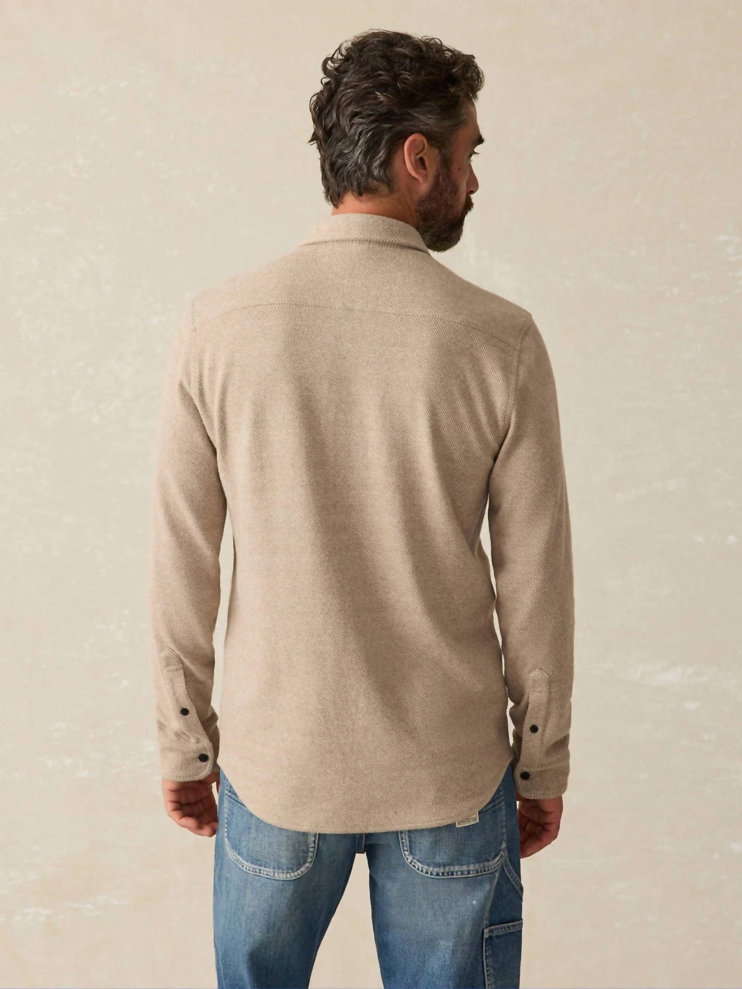 Meet the Faherty Legend Sweater Shirt in Timber Twill, the closest-to-perfect men's casual button-down. With long sleeves and a relaxed chest fit, it tapers slightly at the waist for a tailored look, complemented by a spread collar and button closure. The composition is 65% REPREVE® Recycled Polyester, 30% LENZING™ ECOVERO™ Viscose, and 5% Elastane, promising an incredibly soft knit texture. Featuring two chest buttoned patch pockets, this shirt is practical yet stylish. Care instructions advise turning inside out, machine wash cold on a gentle cycle, and tumble dry low for best results.