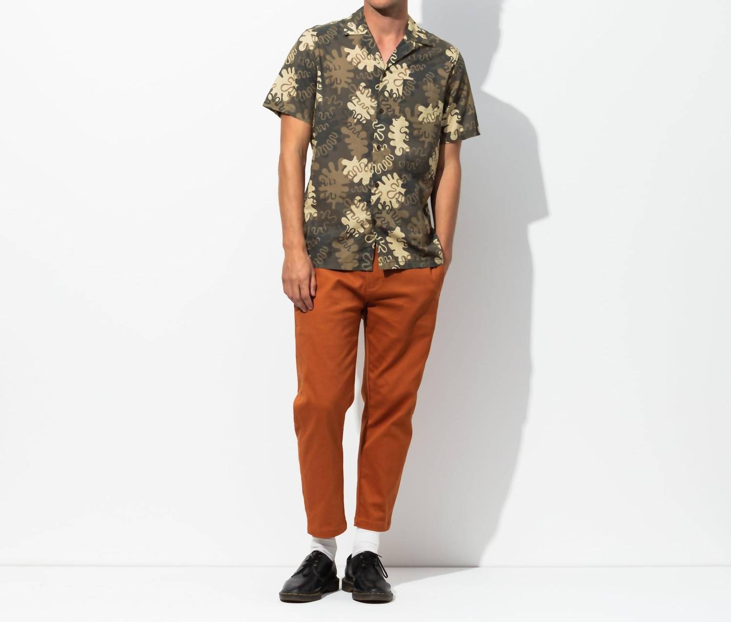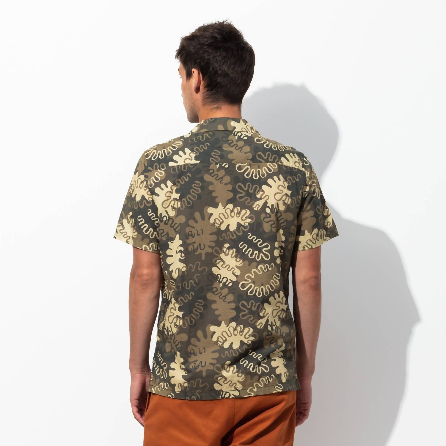 Introducing the Camino Shirt by Banks Journal, a perfect statement piece for your summer wardrobe in Dark Olive. This casual button-down shirt showcases a stylish all-over pattern, short sleeves, and a classic camp collar for a laid-back look. Crafted from 100% Cotton, it features a practical chest pocket and a straight hem. Closure: Button closure. Enjoy the added sustainable touch with recycled polyester woven labels and FSC-approved paper swing tags.
