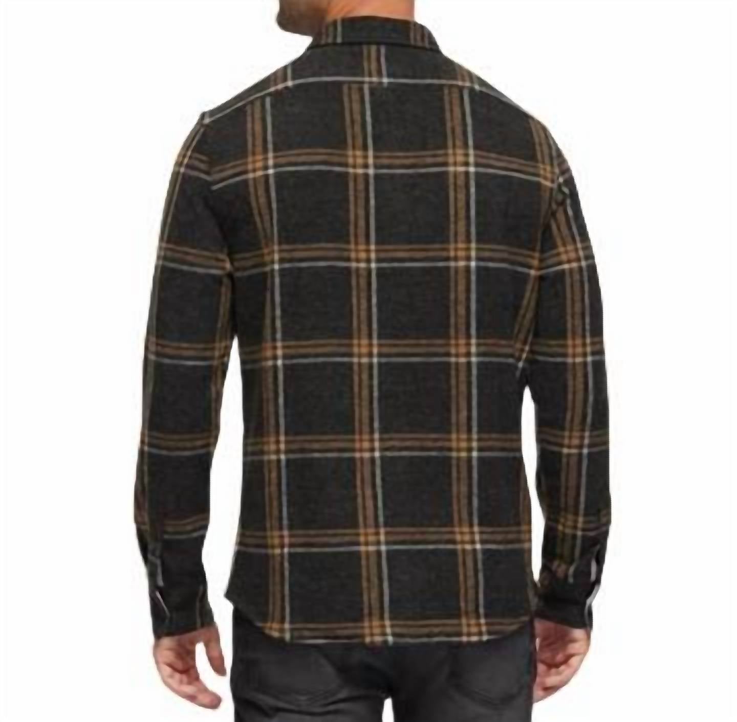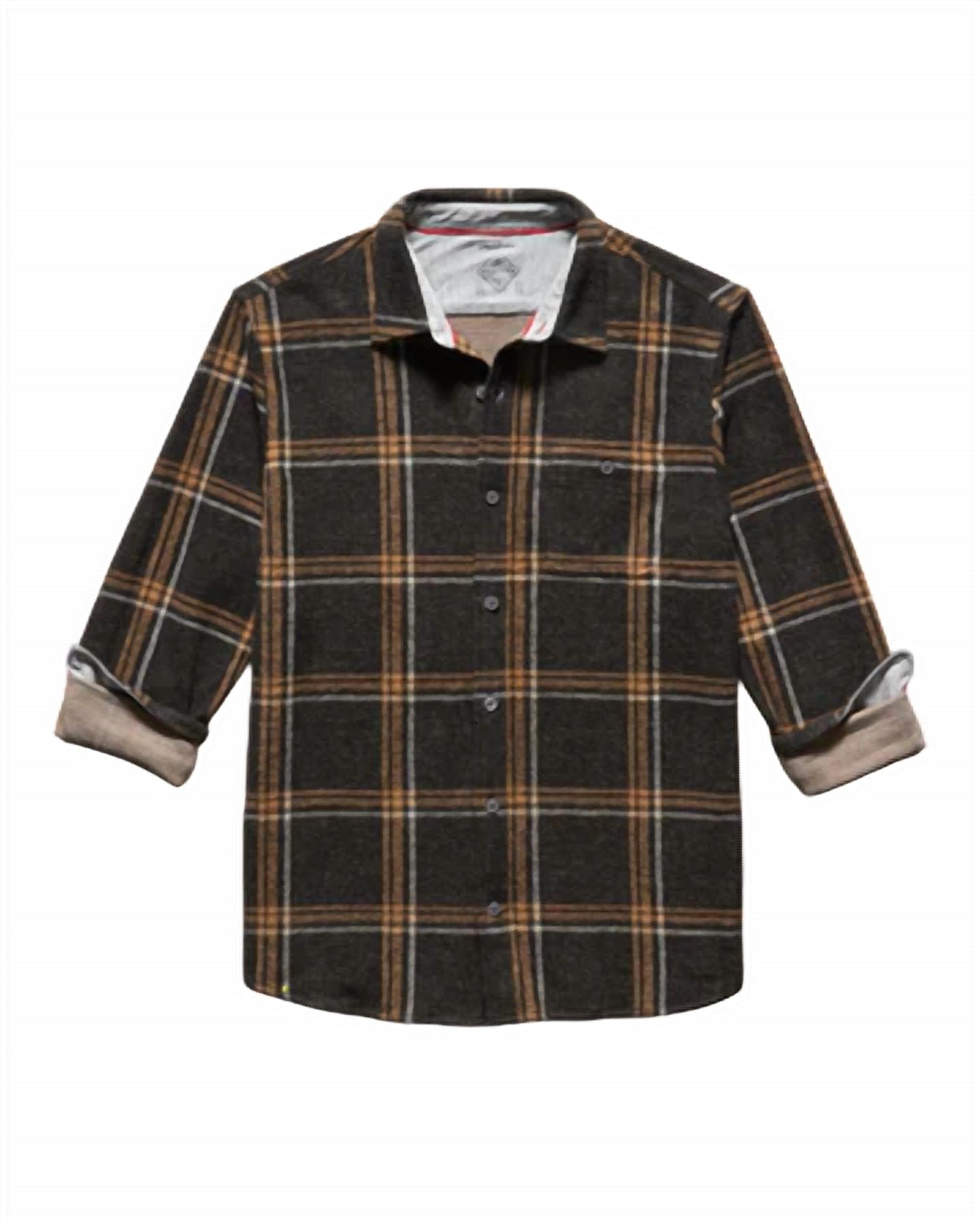Introducing the Flags & Anthem Long Sleeve Hero Knit Flannel Shirt in a sophisticated charcoal and brown plaid and check pattern. Crafted with a heavy-weight blend of 72% polyester, 27% rayon, and 1% span, this casual button-down shirt is designed for optimal comfort and durability. Featuring a convenient button closure, it measures 29.5 inches in length and includes practical pockets. Easy to care for, simply machine wash to maintain its quality and appeal.