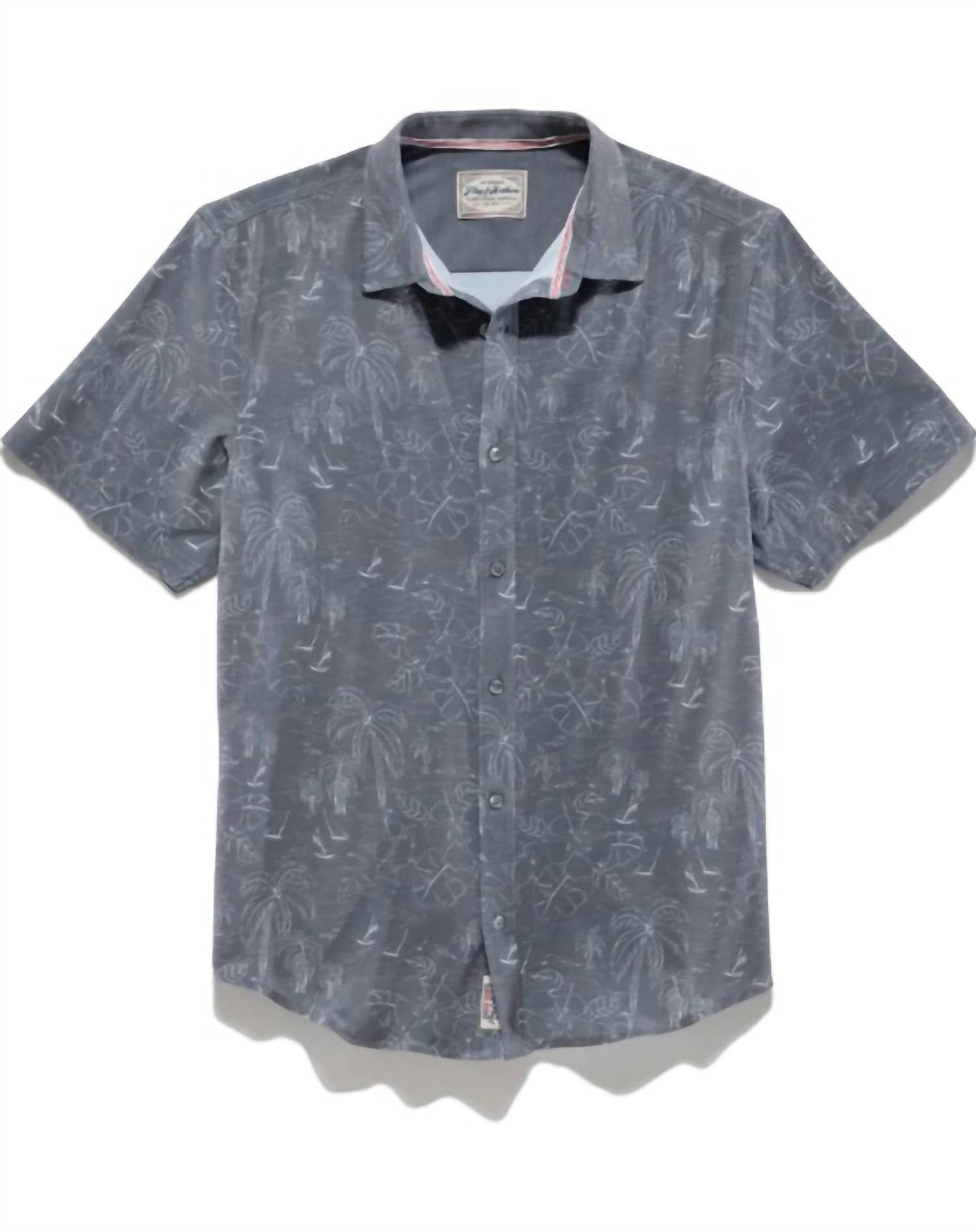 Embrace all-day comfort with the Richfield Palm Print Performance Shirt by Flags & Anthem, crafted for optimal mobility and a superior fit. This short-sleeved shirt in Charcoal Leaf features a stylish patterned design that keeps you cool with its moisture-wicking polyester, cotton, and spandex blend. Its button closure and tailored athletic fit make it ideal for both casual and formal settings. With a medium length of 29.5 inches, machine washable convenience, and UPF sun protection, it's your go-to piece for the spring season.