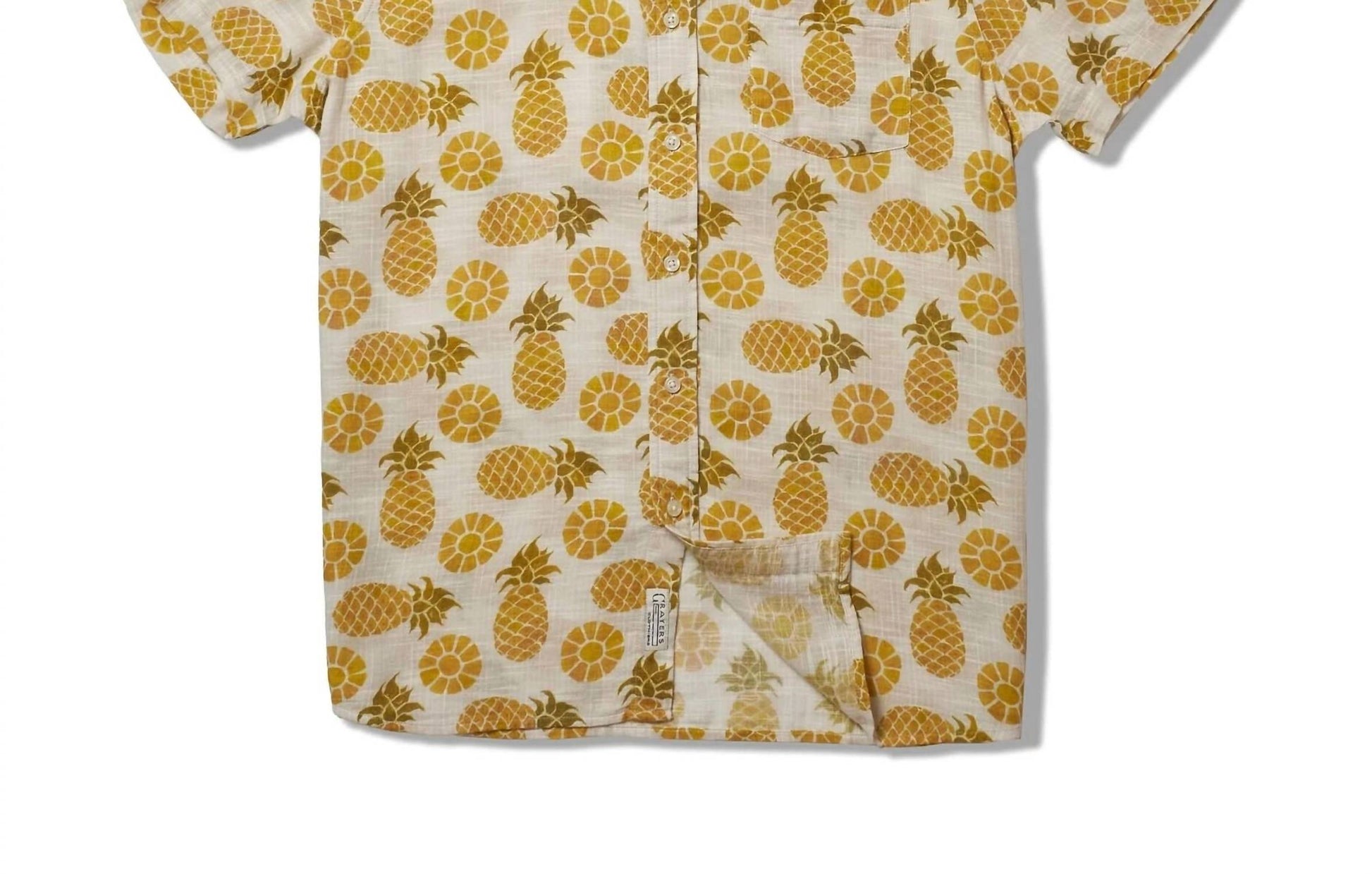 Introducing the Grayers Madras Cottage Loom Shirt, showcasing the perfect blend of heritage and style in its vibrant Pineapple Slice color. This men's short sleeve shirt is crafted from 100% enzyme-washed cotton for a soft, breathable fit. Sourced from an authentic weaving mill in Chennai, India, the yarn-dyed, plain weave fabric ensures lasting color and comfort. Detailed with a spread collar, natural button closure, and a single chest pocket featuring a vintage pineapple motif, this shirt is ideal for any warm-weather occasion. Machine wash.