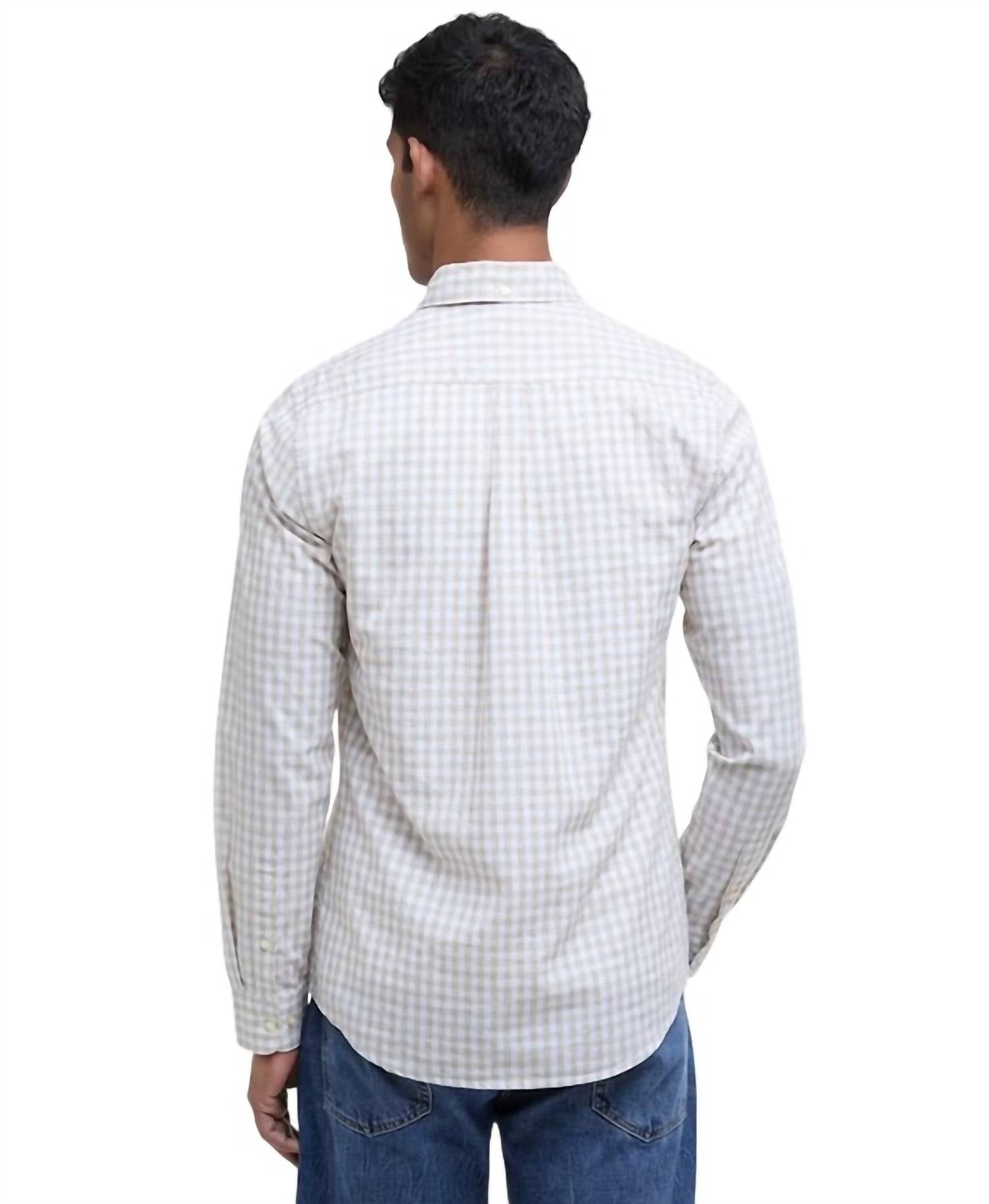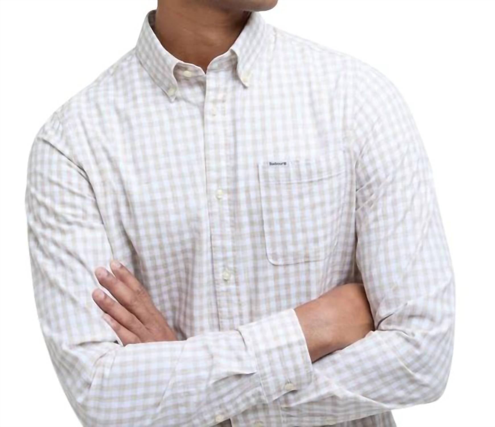 Discover the Barbour Kanehill Tailored Shirt, a timeless piece in stone, perfect for smart-casual ensembles. This men's shirt features long sleeves and is meticulously crafted from a breathable cotton blend for comfort and layering ease. Adorned with a vibrant gingham pattern, it includes a classic spade chest pocket and a convenient button closure. Care: Machine wash. Ideal for vacation and summer occasions, this piece effortlessly merges practicality with classic 90s fashion trends.