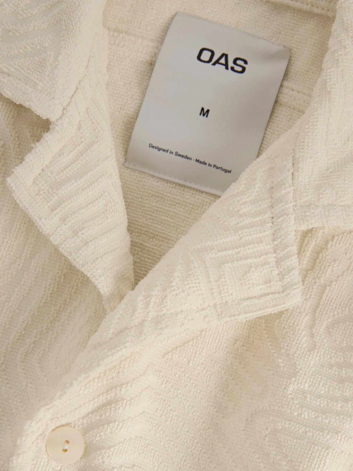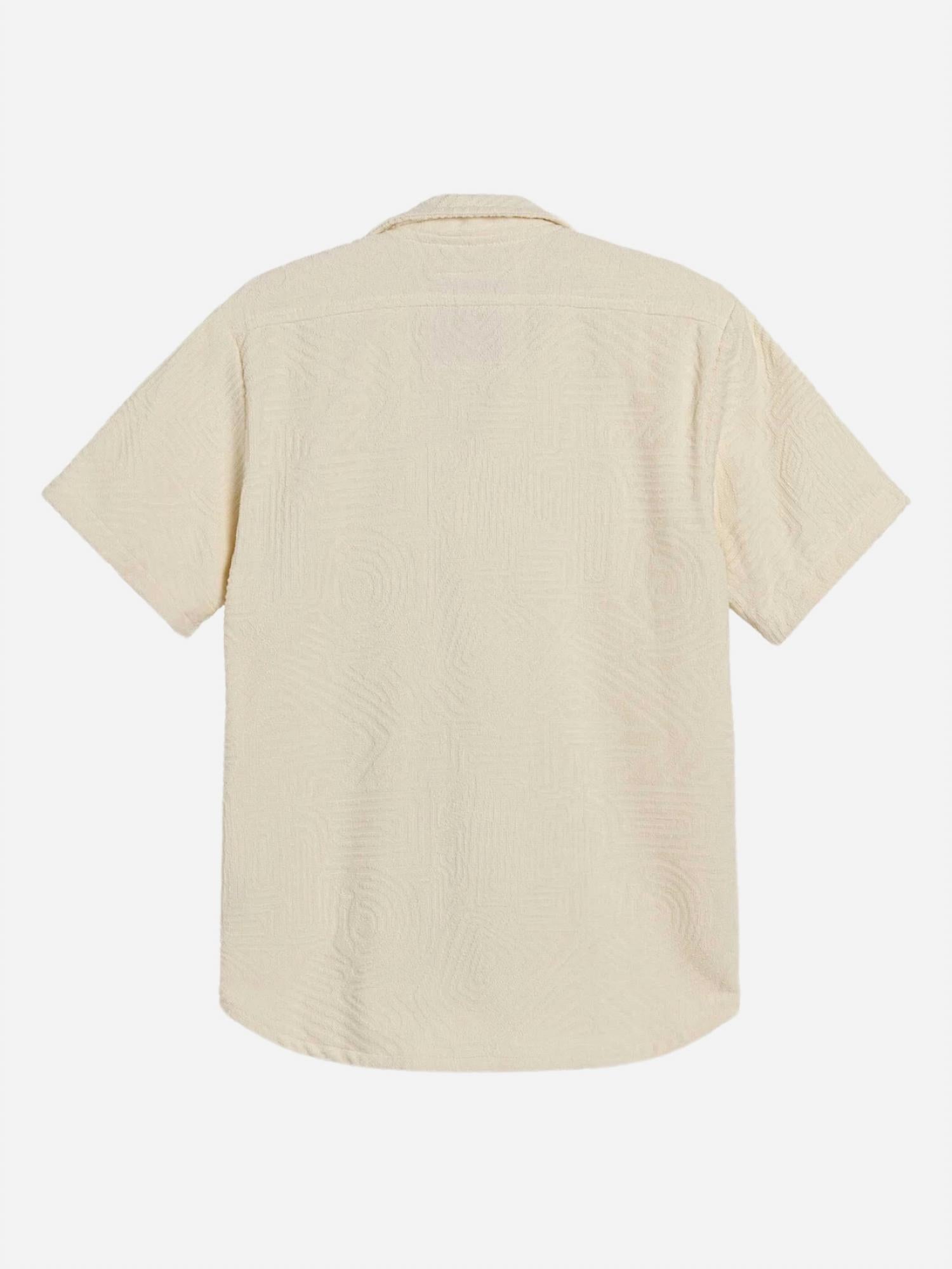 Elevate your summer wardrobe with the Cream Golconda Cuba Terry Shirt by OAS, featuring a distinctive hand-drawn labyrinthine pattern. Crafted from 100% midweight cotton terry, this shirt offers a sumptuous texture that is both soft and breathable. Designed with short sleeves, it includes a resort collar and a button closure for a relaxed yet polished look. Made in Portugal, this shirt showcases a curved hemline and slightly dropped shoulders, ensuring a true-to-size relaxed fit. Model is 6'0" and wears a size M.