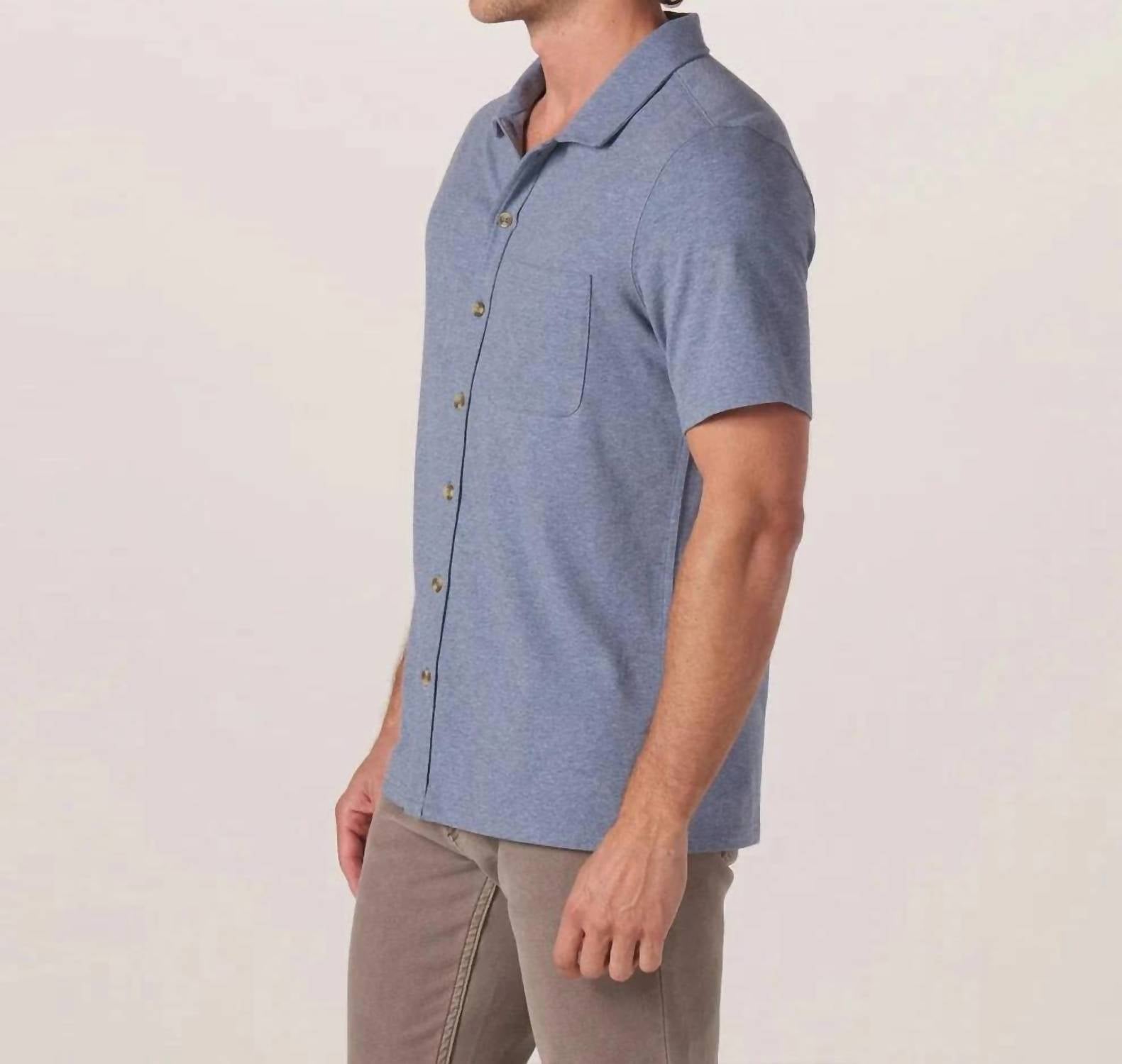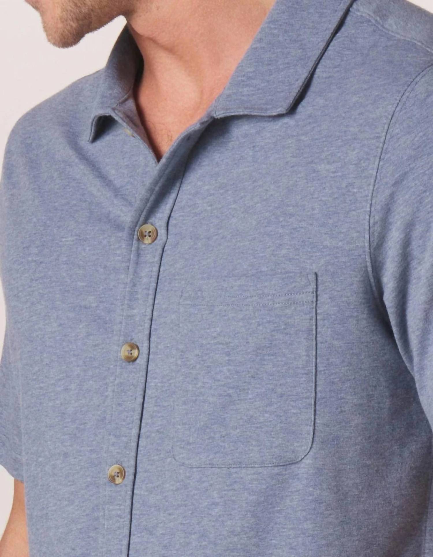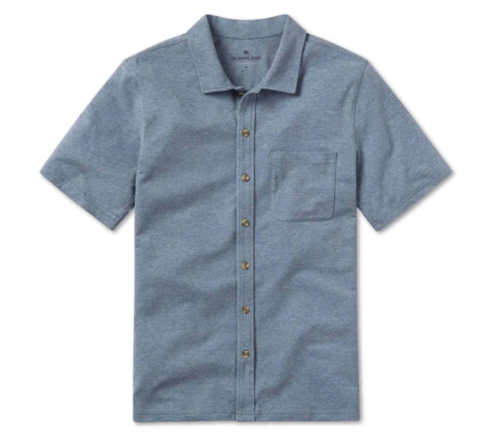 Introducing the Puremeso Active Button Down Shirt by The Normal Brand, the ultimate in summer workwear style. This Lake Blue casual button-down features a short sleeve design and is crafted from a lightweight jersey blend with 57% Cotton, 38% Polyester, and 5% Spandex, ensuring a smooth, exceptionally soft touch and maximum comfort. Designed with functional elements like a 2 Ply collar and button closure, this shirt also includes a back 1/2 moon and an embroidered bear logo, showcasing meticulous craftsmanship. For care, machine wash on a gentle cycle and tumble dry low.