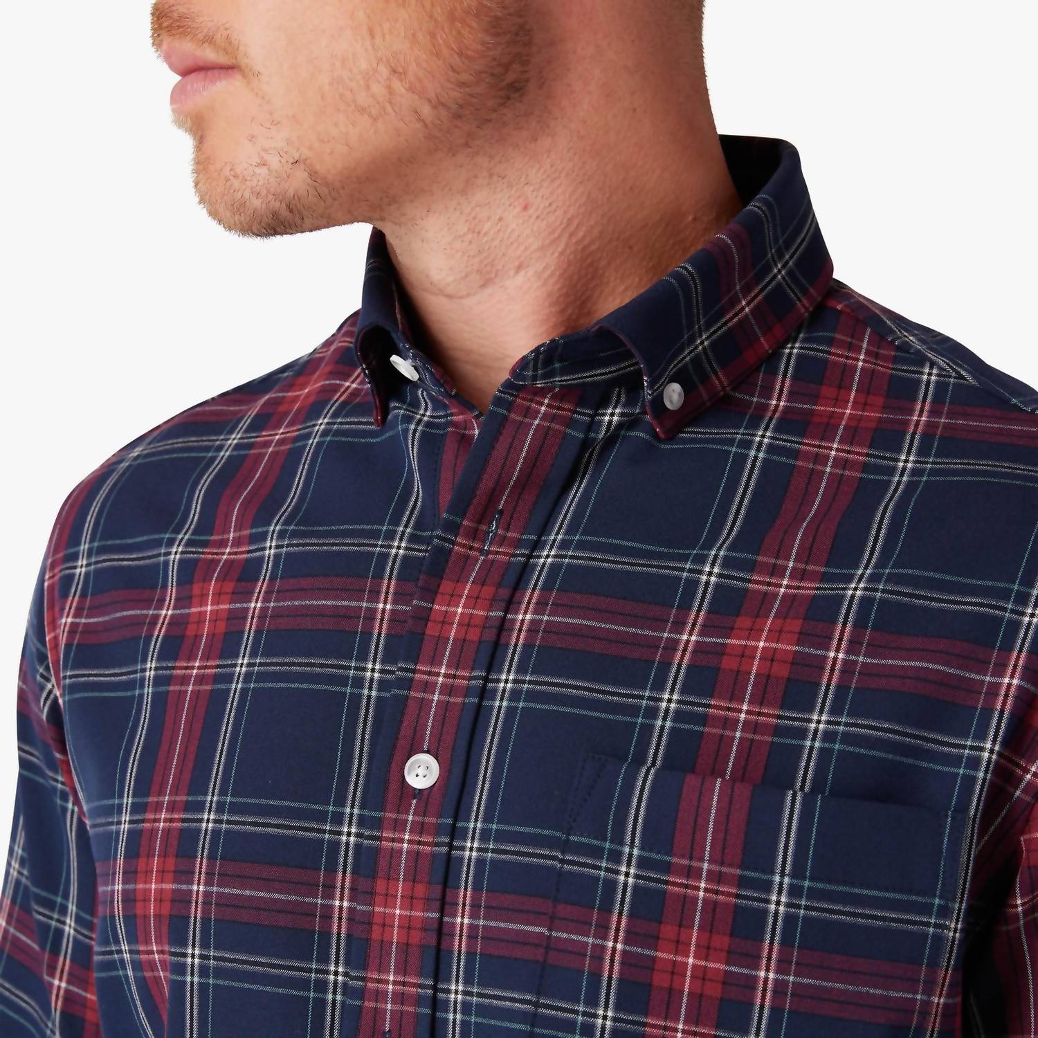 Exposed button collar. Set on placket. Chest pocket. No Tuck length. Shirt is 2" shorter in the body and is meant to hit mid-zipper. 65% Polyester, 32% Rayon, 3% Spandex.