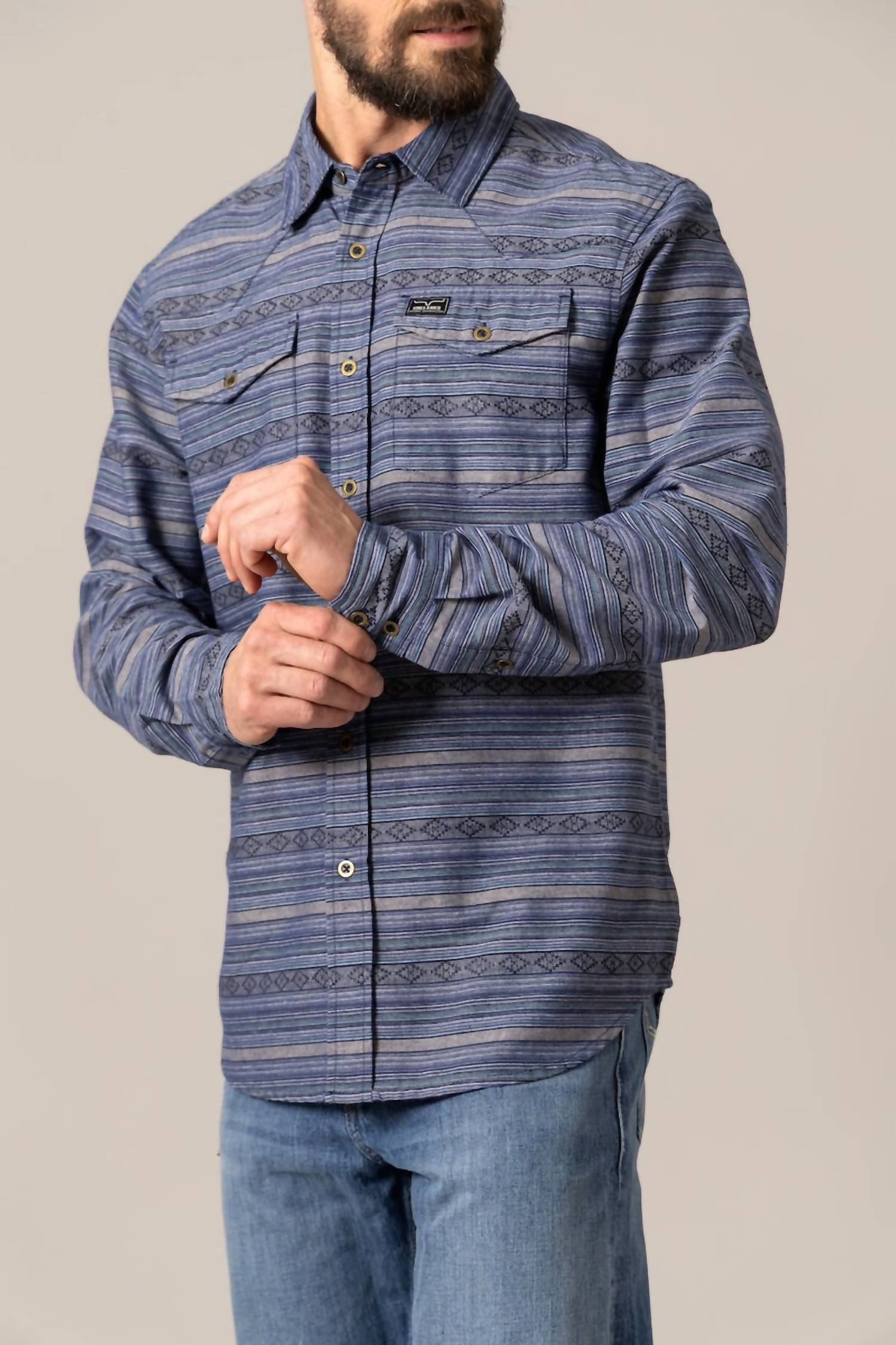 Introducing the Kimes Ranch Ortega Shirt in Indigo, a staple for every man's wardrobe with a relaxed, long fit. This casual button-down shirt features long sleeves and a classic collar, adorned with a subtle fine horizontal stripe pattern that elevates your everyday look. Crafted from a durable yet stylish cotton blend, comprising 65% cotton and 35% polyester, it includes a button front closure and double chest pockets with the Kimes Ranch patch for added functionality. Perfect for any occasion, this piece offers a seamless blend of comfort and sophistication.