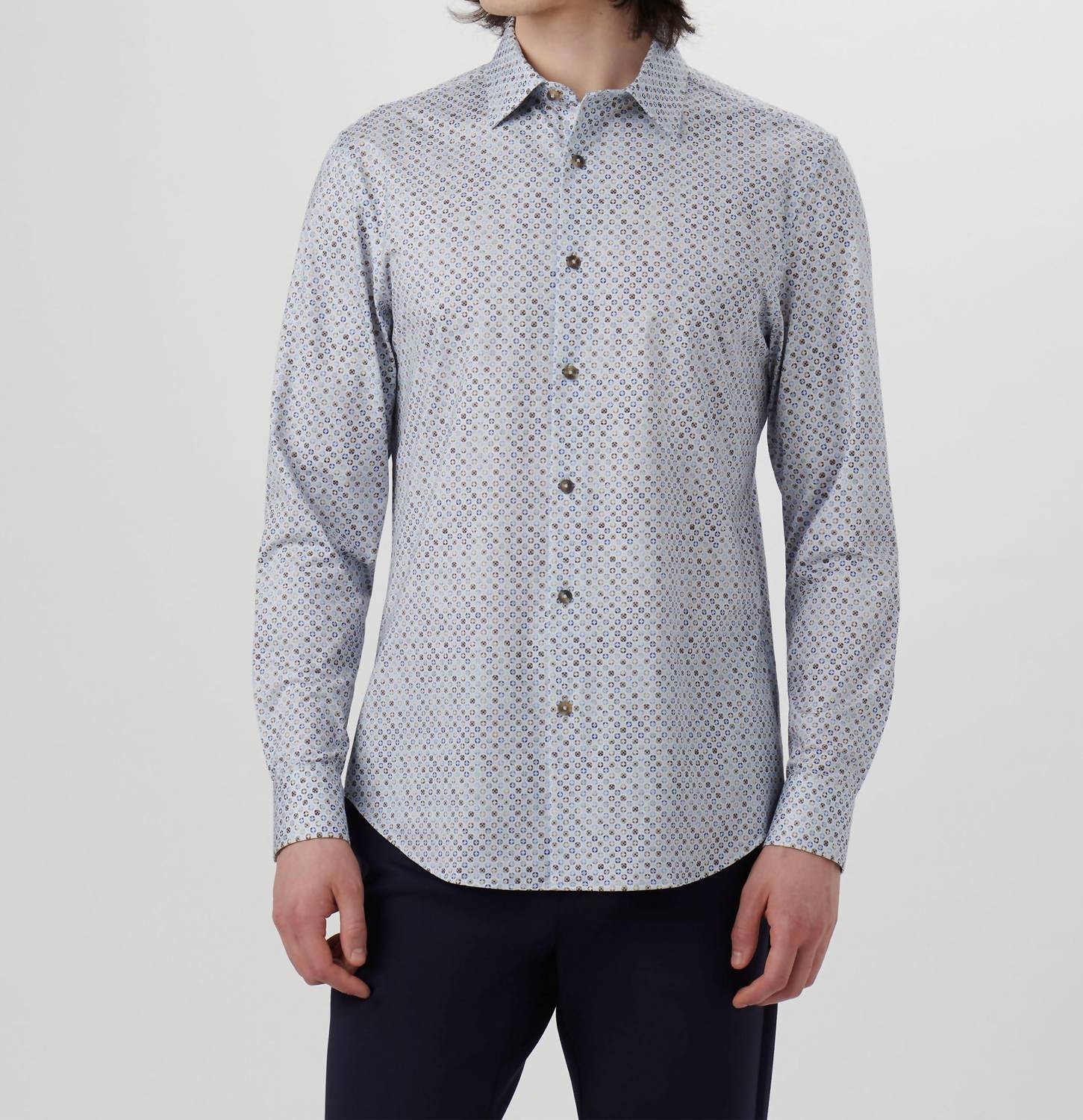 Elevate your wardrobe with the Medalion 6 Way Stretch Long Sleeve by Bugatchi Uomo, a perfect blend of style and functionality. This air blue, long-sleeved shirt features a floral print in OoohCotton, a luxurious material composed of 92% cotton and 8% spandex, promising durability, 8-way stretch, and thermal comfort. With a point collar and full button closure, it ensures a sophisticated look, whether at a spring holiday party or a casual outing. Imported for quality and convenience, this shirt is easy to care for with machine wash-and-go ease.