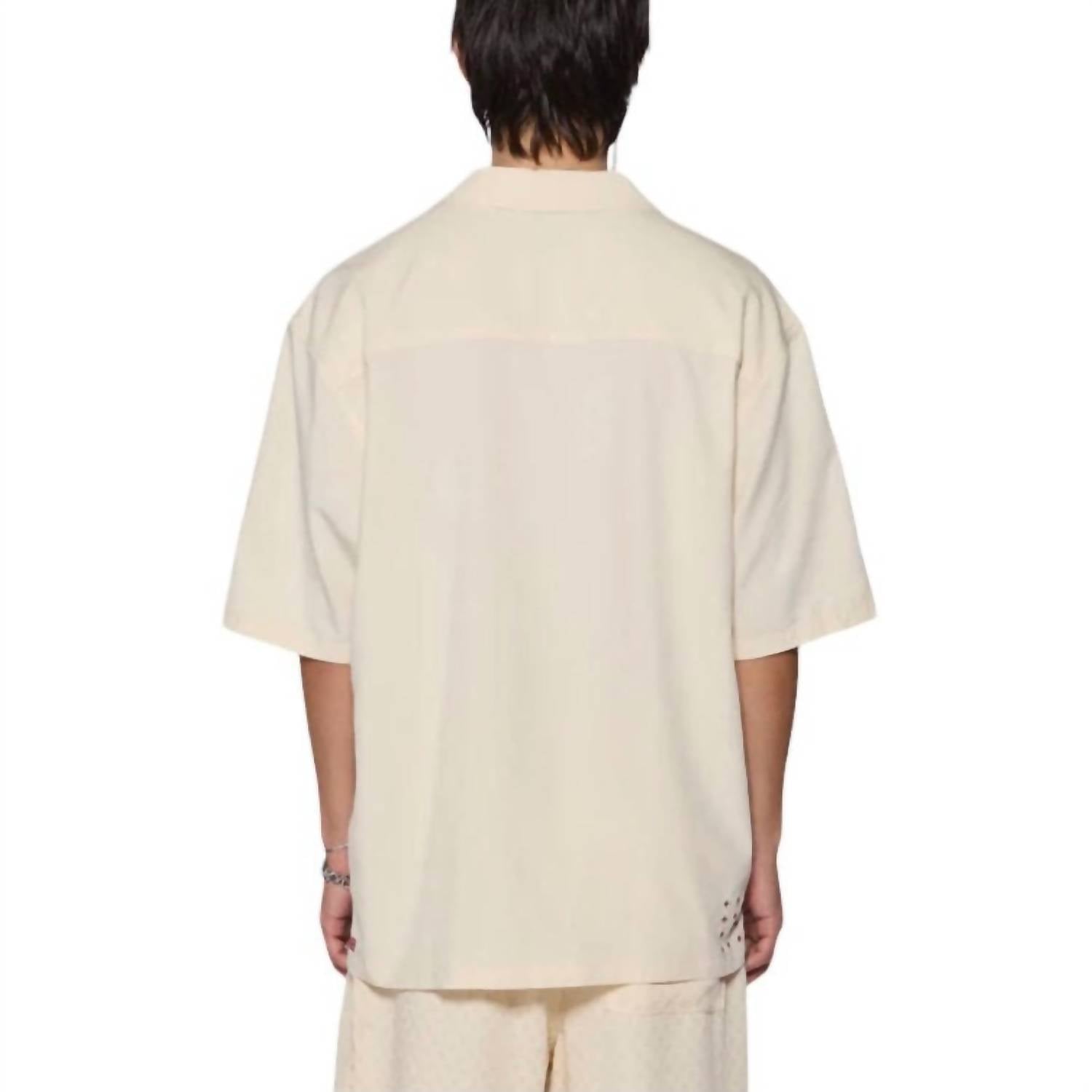 Introducing the 1999 Diner Short Sleeve Shirt by Ksubi, a stylish addition to your vacation wardrobe. This oversized resort shirt, crafted from a viscose blend, comes in a natural ecru shade and features a regular length design. It includes a chest pocket with a notable 1999 embroidered logo and Ksubi branded hardware. Closure: Button closure. Care: Machine wash. Perfect for summer, this minimalist shirt embodies casual sophistication with its solid pattern and collared neckline.