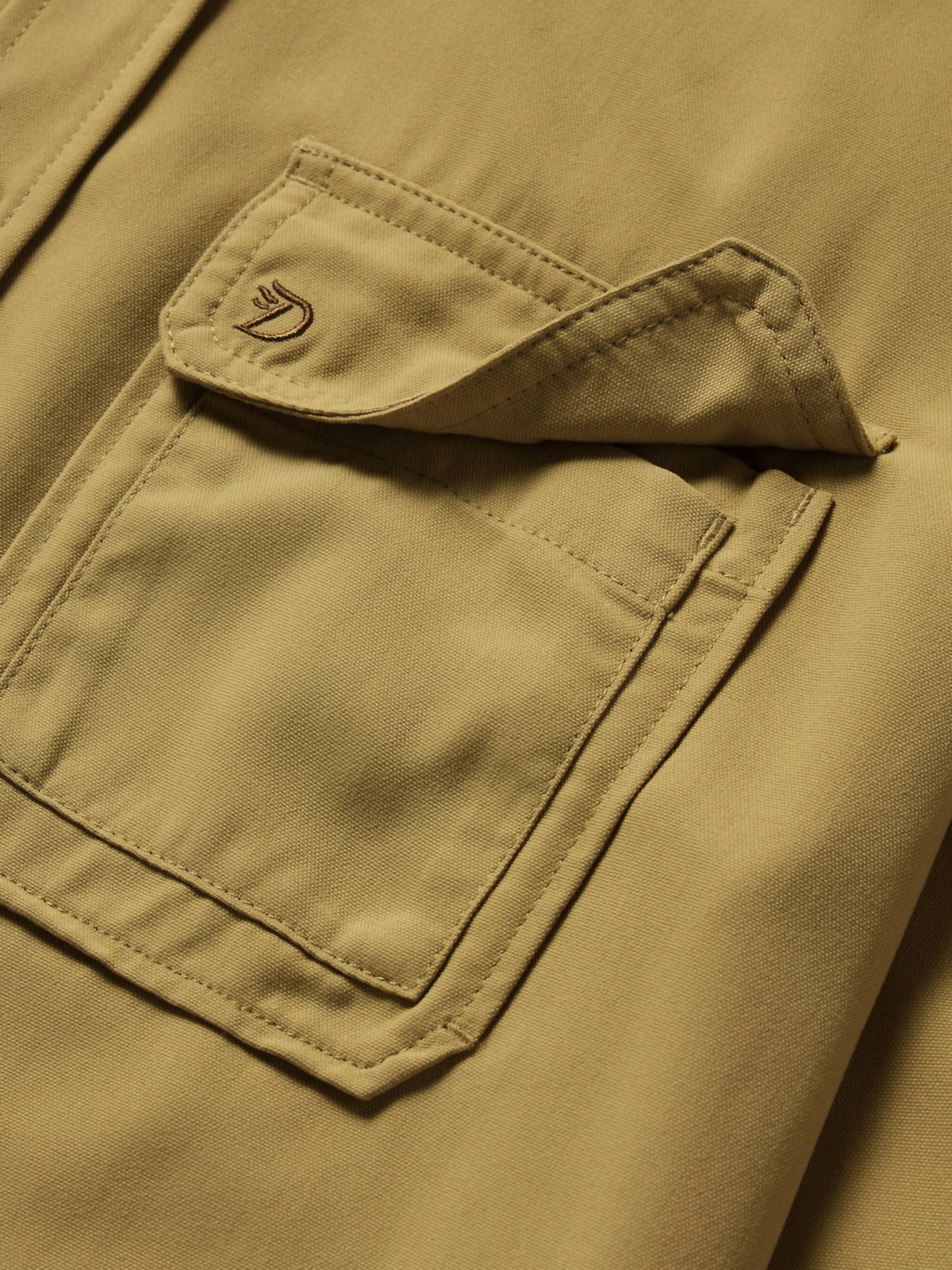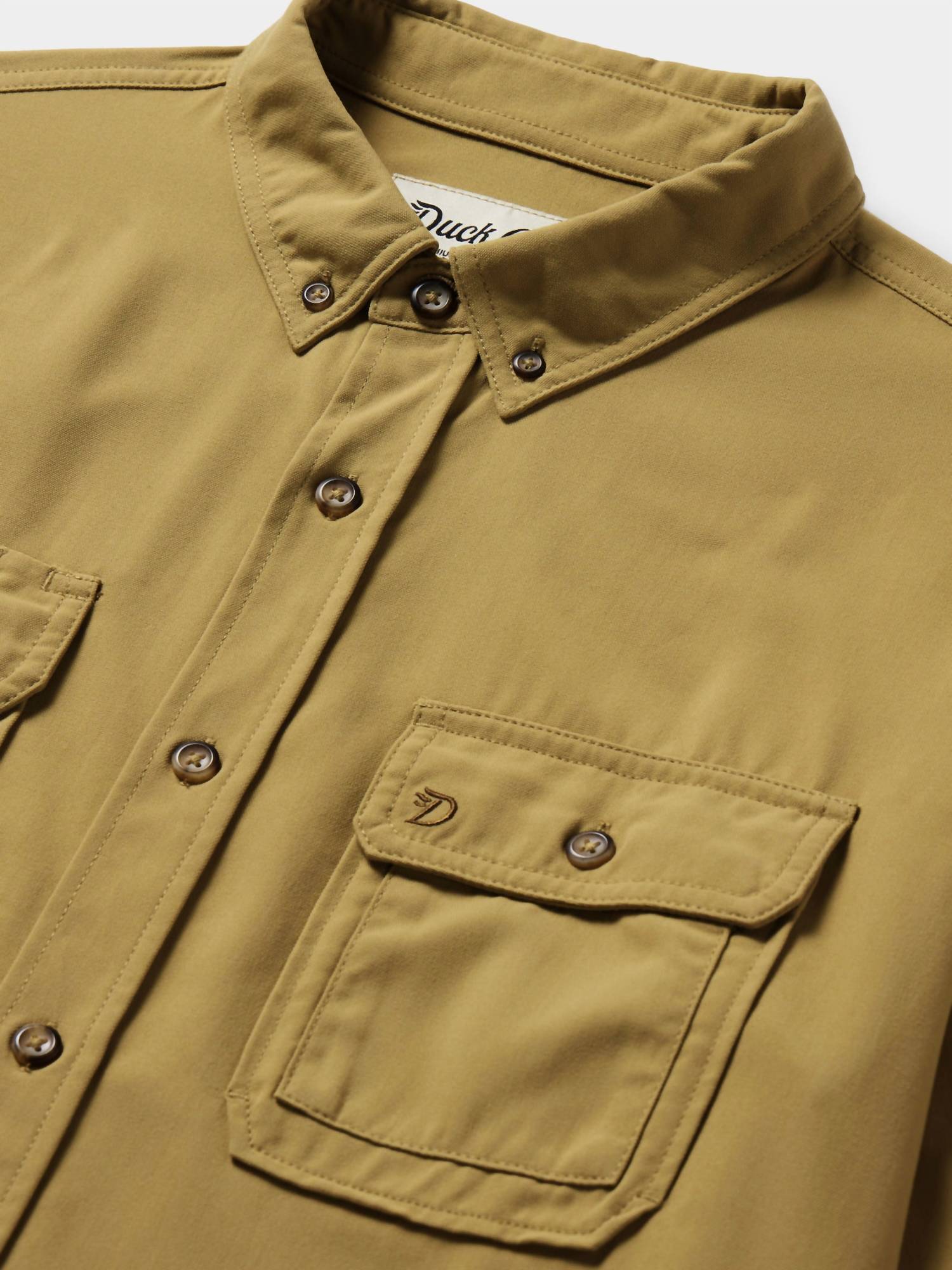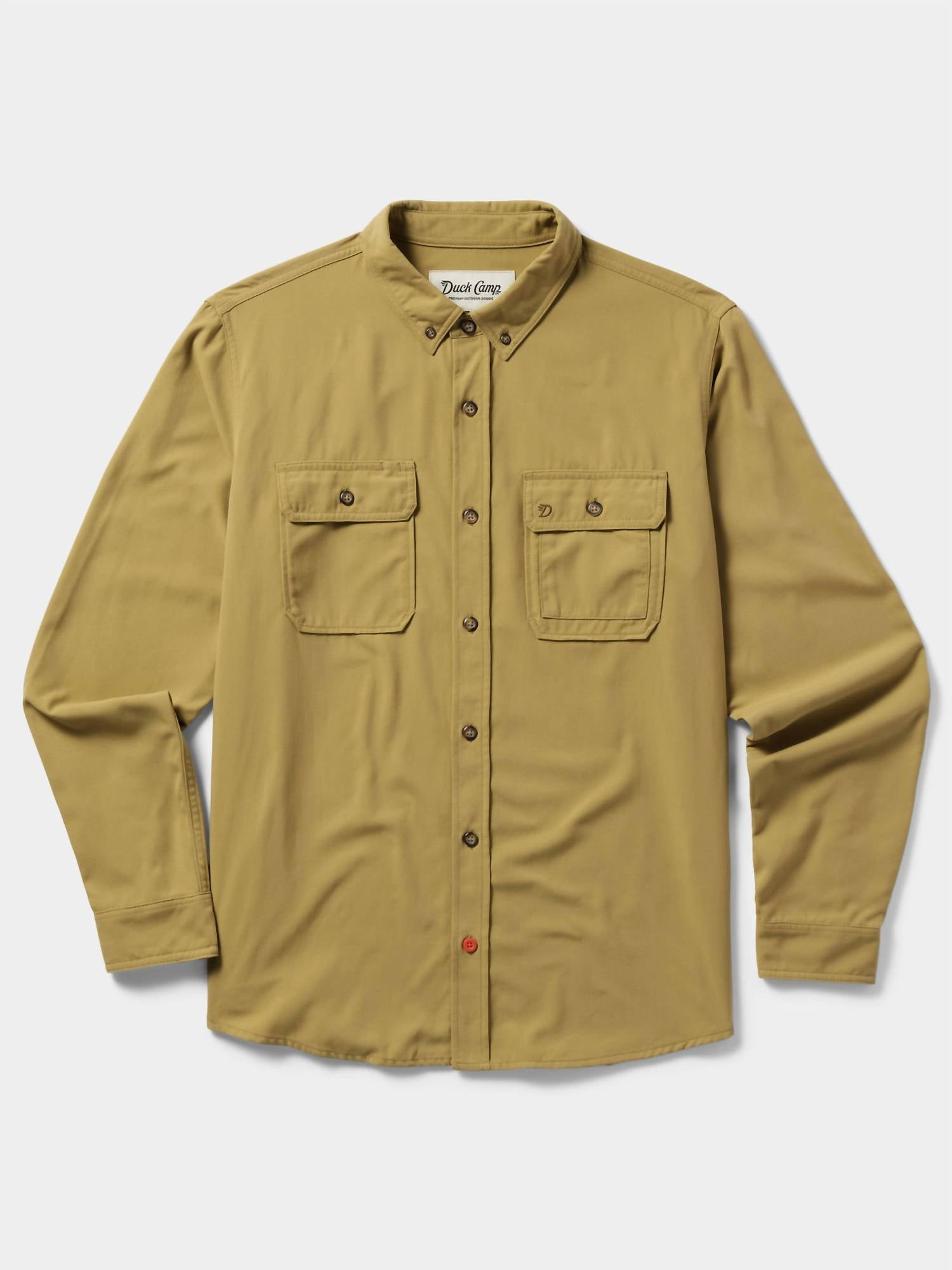 Introducing the Field Shirt by Duck Camp, a stylish and durable addition to any gentleman's wardrobe. This men's long sleeve button-down, crafted from 100% Nylon Plain Weave, comes in a classic wheat hue that's perfect for fall. Designed with a collar neckline, it features double chest pockets, a patch pocket with a secondary top pocket, and a center back pleat for enhanced mobility. This solid-patterned shirt is ideal for various occasions, including church or Father's Day, and requires hand washing to maintain its quality.