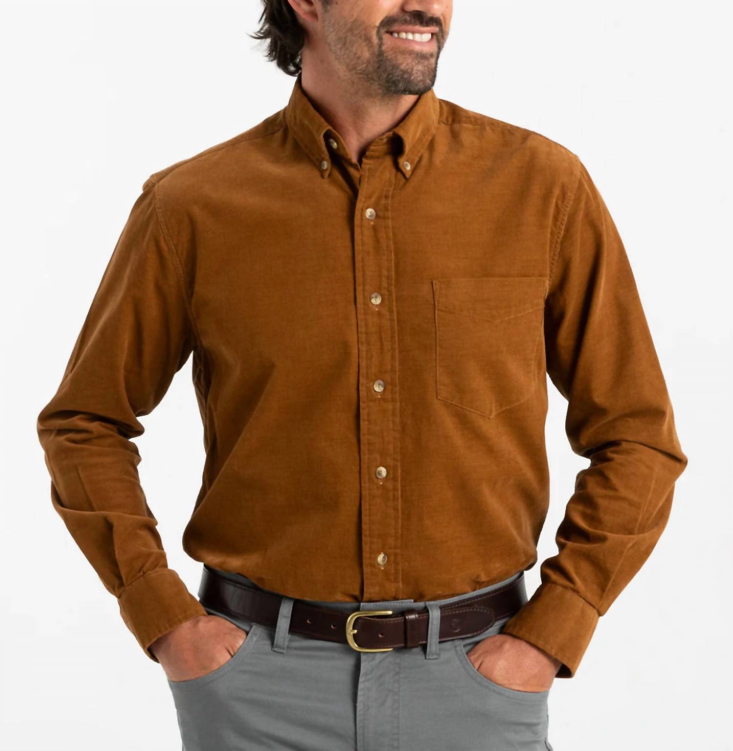 The Whitman Corduroy Sport Shirt by DUCK HEAD offers a refined take on casual elegance with its long sleeves and solid dark amber tone. Made from 100% cotton micro-corduroy, this garment is finely crafted with a button-down collar and tailored fit, perfect for travel or Thanksgiving gatherings. Featuring a button closure with exquisite fisheye horn buttons and a left chest pocket, it exudes thoughtful design for vintage-inspired style. Care Instructions: Machine wash cold with like colors, tumble dry low, and cool iron inside out if needed.